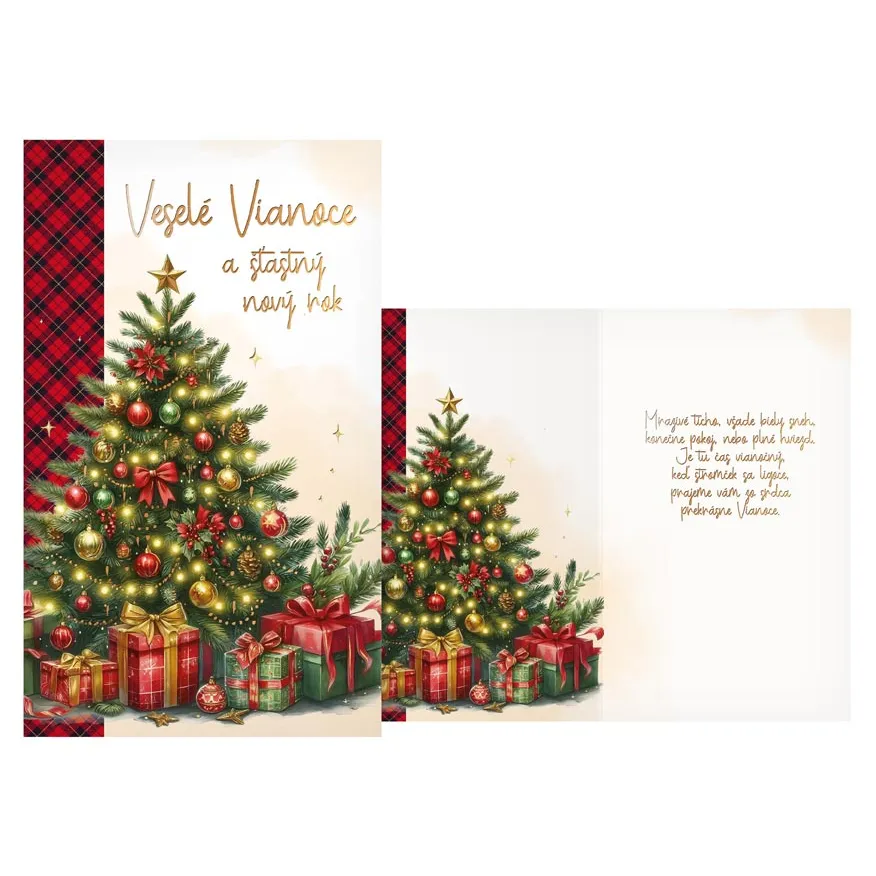 Vánoční přání s klasickým motivem krásně nazdobeného vánočního stromku a dárků je ideálním způsobem, jak popřát svým blízkým veselé Vánoce a šťastný nový rok. Jeho tradiční design se zlatými a červenými ozdobami na vánočním stromku, spolu s elegantním vzkazem uvnitř, vytváří dokonalou sváteční atmosféru. Je vhodné jak pro rodinu a přátele, tak pro kolegy či obchodní partnery.