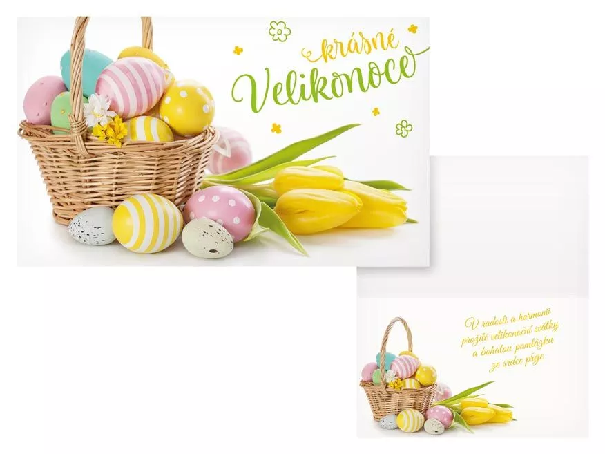 Velikonoční přání s textem uvnitř. Blahopřání s obrázkem kraslic a tulipánů.