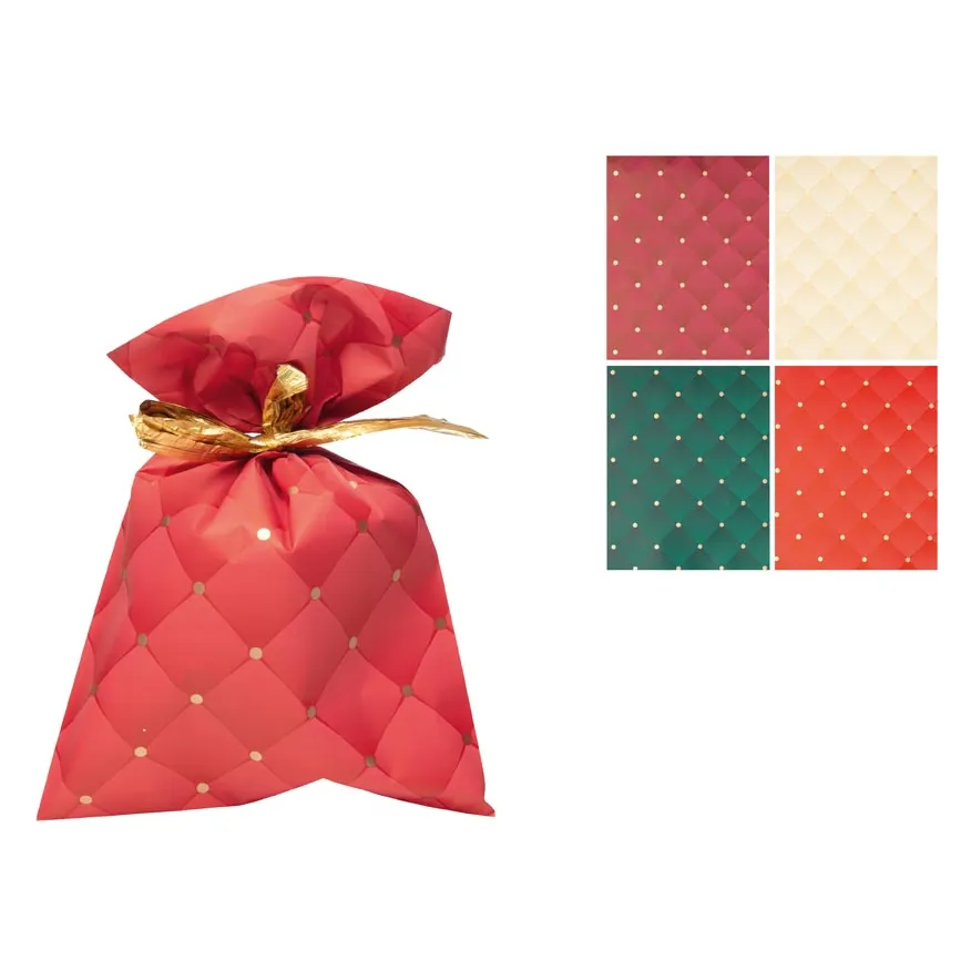 Vánoční dárkový sáček, vyrobený z lesklého materiálu, zdobený motivem připomínajícím prošívaný vzor s malými zlatými tečkami. Umožňuje snadno zabalit různé druhy drobných dárků bez nutnosti použití balicího papíru. Praktický a elegantní způsob balení, který šetří čas i námahu. Sáček můžete uzavřít vázací stuhou a tím ho dozdobit.