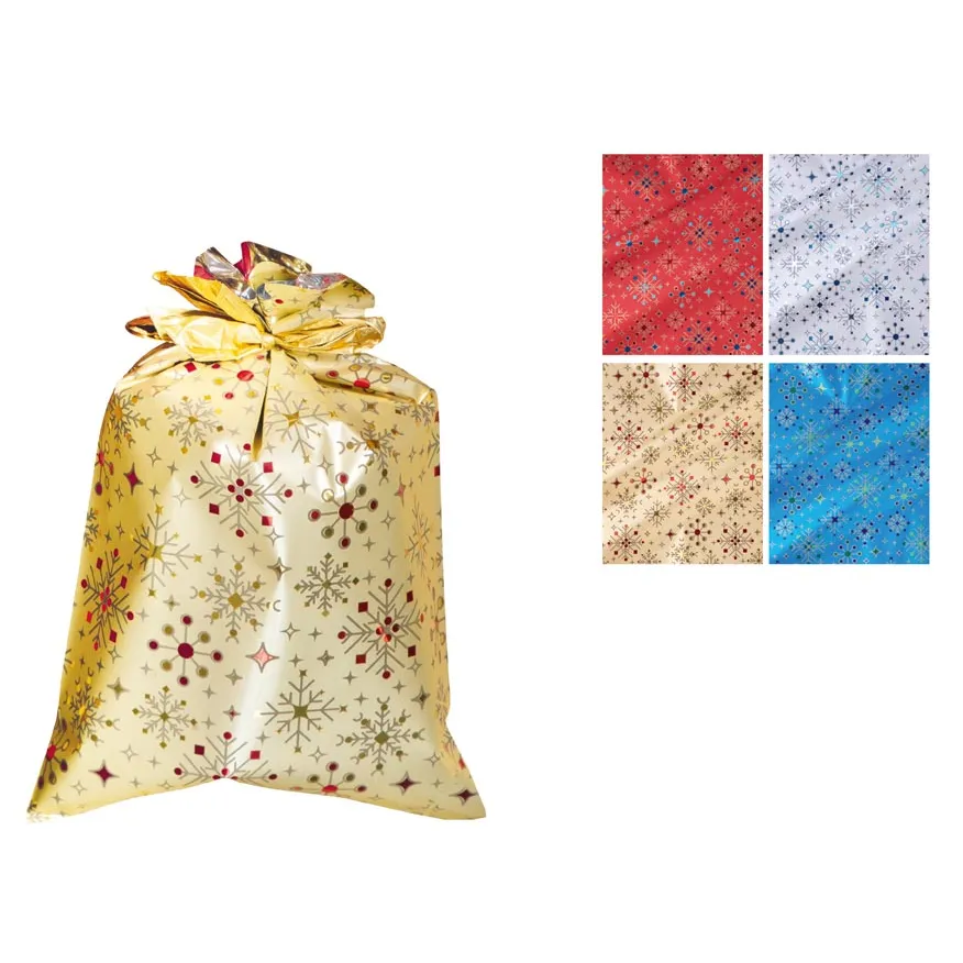 Vánoční dárkový sáček, vyrobený z lesklého materiálu s dekorativním potiskem sněhových vloček a hvězdiček. Umožňuje snadno zabalit různé druhy drobných dárků bez nutnosti použití balicího papíru. Praktický a elegantní způsob balení, který šetří čas i námahu. Sáček můžete uzavřít vázací stuhou a tím ho dozdobit.