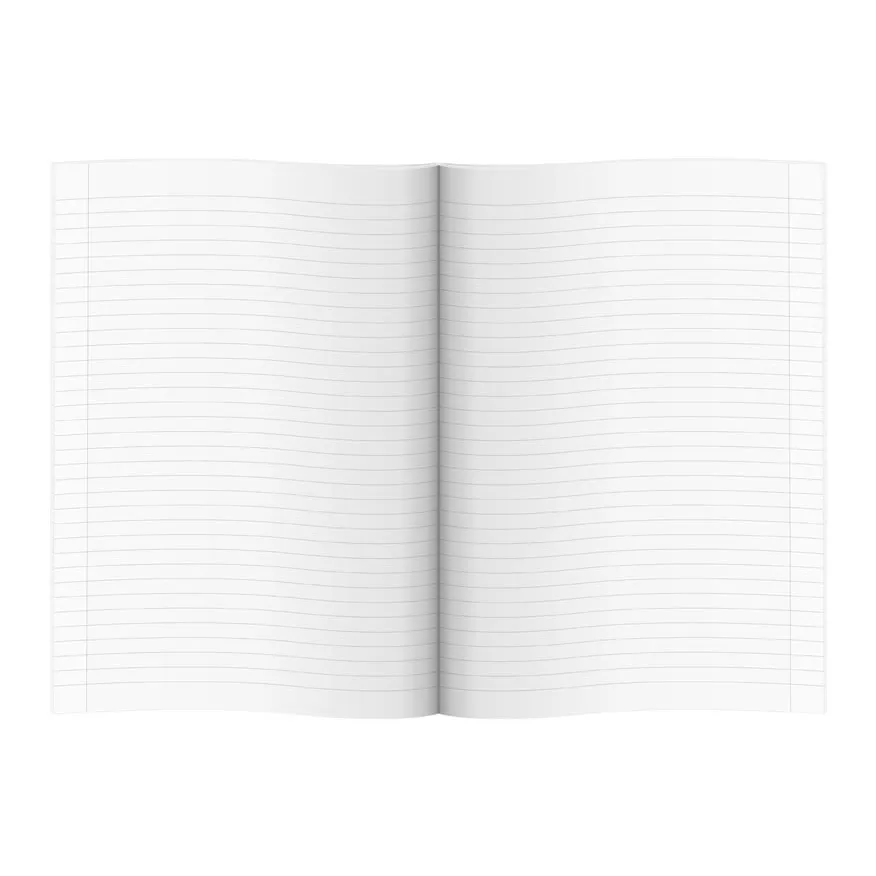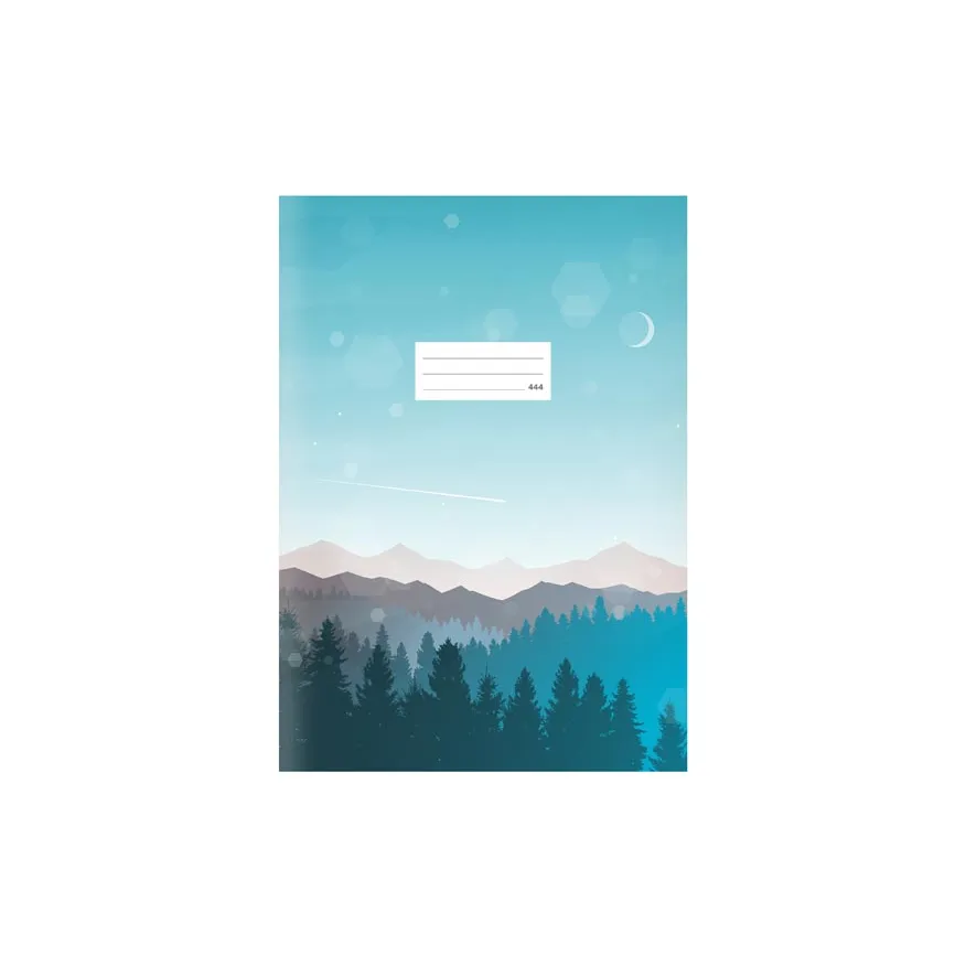 Školní linkovaný sešit ve formátu A4, laděný do modra s motivem krajiny, v originálních deskách s matným laminem a lokálním UV lakem. Stránky jsou opatřené okraji o šířce 1,5 cm.