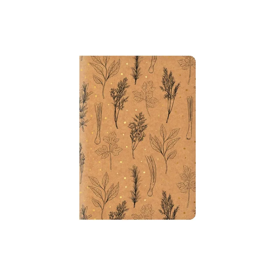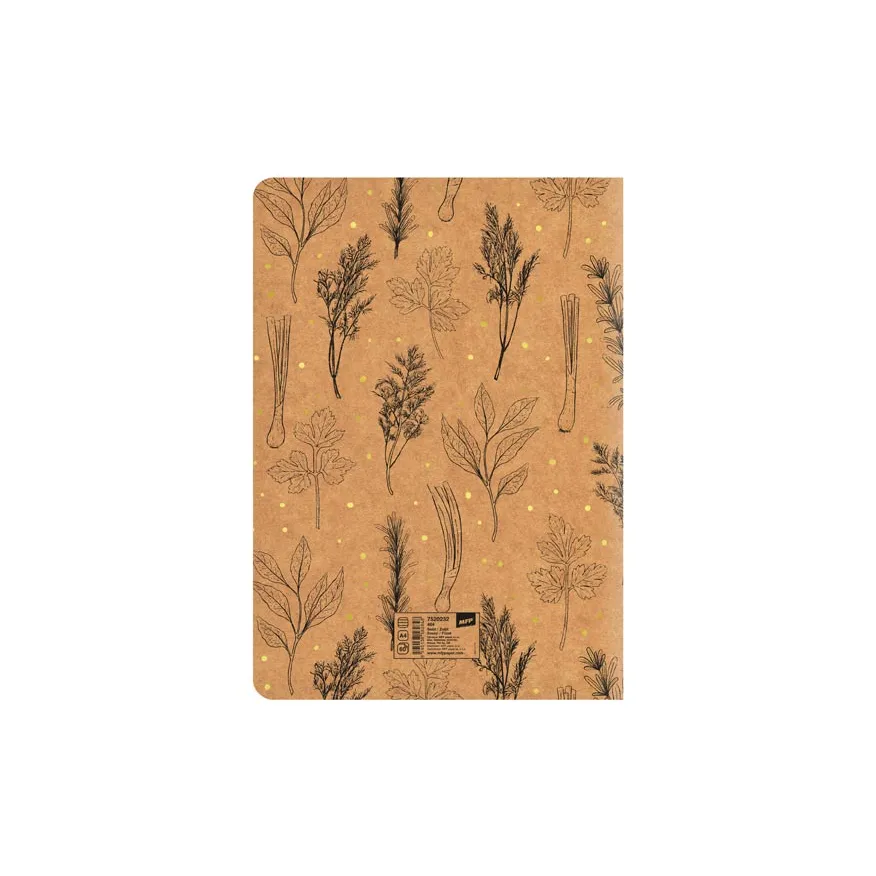 Školní linkovaný sešit ve formátu A4, v hnědé barvě, s motivem rostlin, v originálních deskách z kraftového papíru. Stránky jsou opatřeny okraji o šířce 1,5 cm.