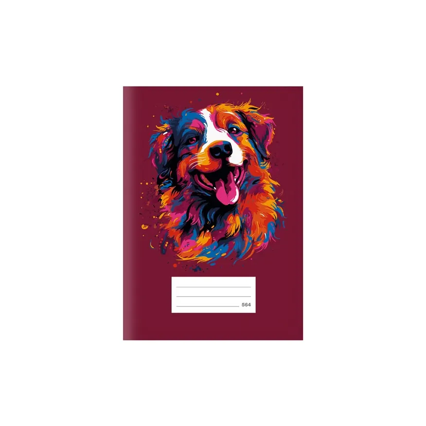 Školní linkovaný sešit ve formátu A5, v bordó barvě, s motivem psa, v originálních deskách s matným laminem a lokálním UV lakem. Stránky jsou opatřeny okraji o šířce 1,5 cm.