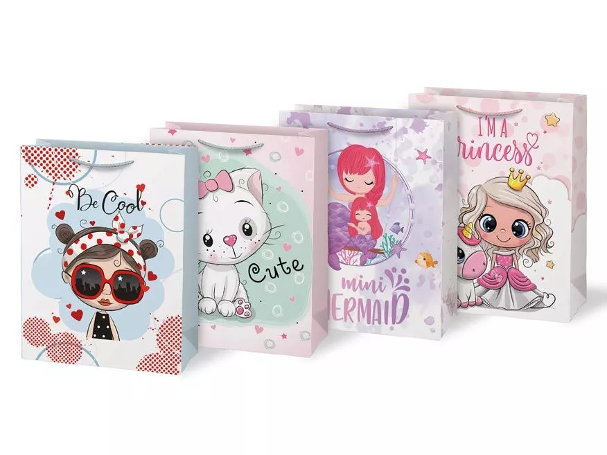 MFP taška dárková T 5 mix č.74 260x340x140 - 5251215. Každý dárek musí být v něčem zabalený. Pokud nemáte čas balit ho do balicího papíru, máme pro Vás na výběr nejrůznější dárkové tašky. MOTIVY: nápis "I am so pretty", biker, zvířata (kočky a rybky), smajlíci. Taška má pevné ucho pro snadné přenášení a štítek pro vepsání jména či přání.