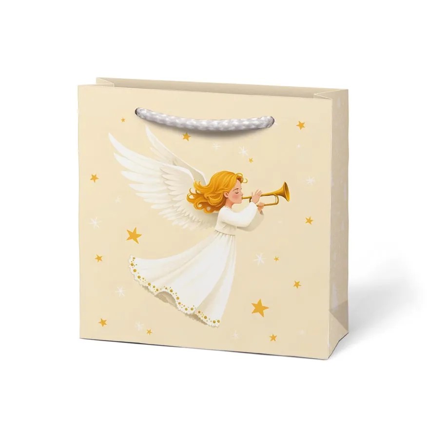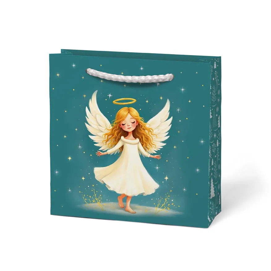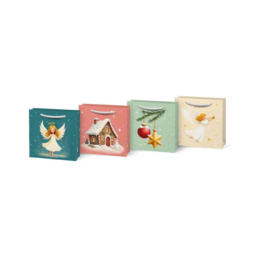 Dárková papírová taška T0 s kouzelným vánočním motivem – ideální na drobné dárky, šperky, přání nebo malou pozornost od srdce. Ilustrace andílků, vánočních ozdob a zasněžené chaloupky vytvářejí tu pravou sváteční náladu.