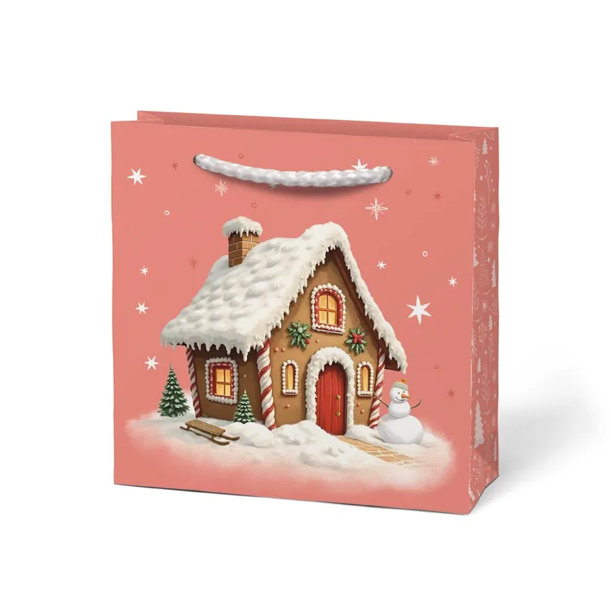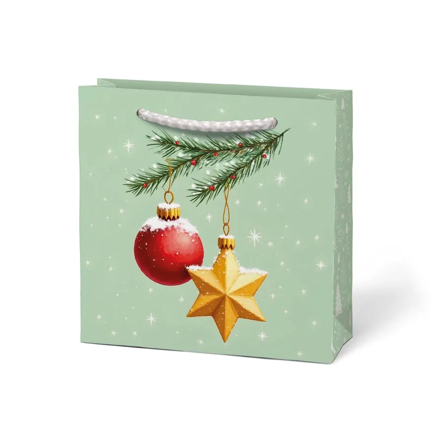 Díky malému formátu působí taška mile a osobně – jako drobná pozornost, která potěší ještě před rozbalením. Taška je doplněna bílými šňůrkovými uchy, které jsou praktické a ladí s celkovým vzhledem. Skvělá volba pro sváteční balení drobných dárků s vánoční atmosférou.