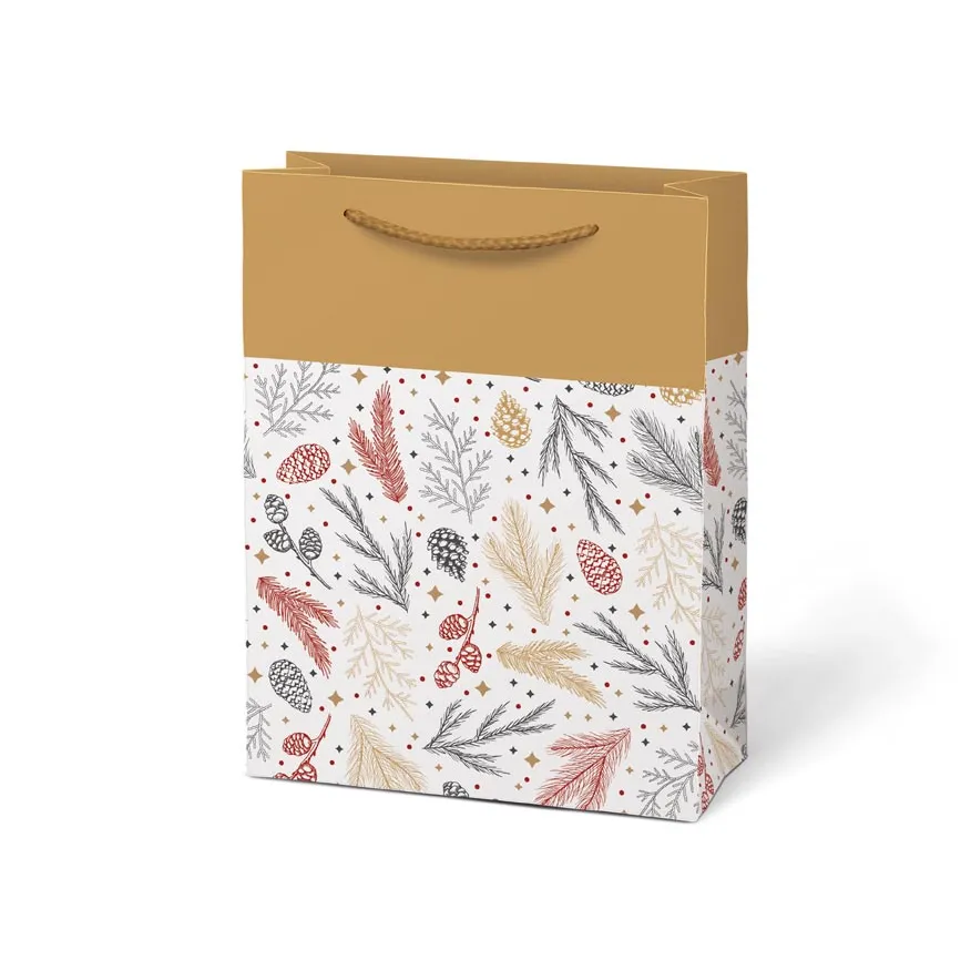 Pokud hledáte decentní, ale stylový způsob balení vánočních dárků, tato dárková papírová taška MFP T4 vás nadchne. Motivy větviček, šišek a jemných vánočních vzorů dodávají tašce elegantní vzhled, který potěší každého obdarovaného. Díky svému praktickému rozměru je ideální pro středně velké dárky.