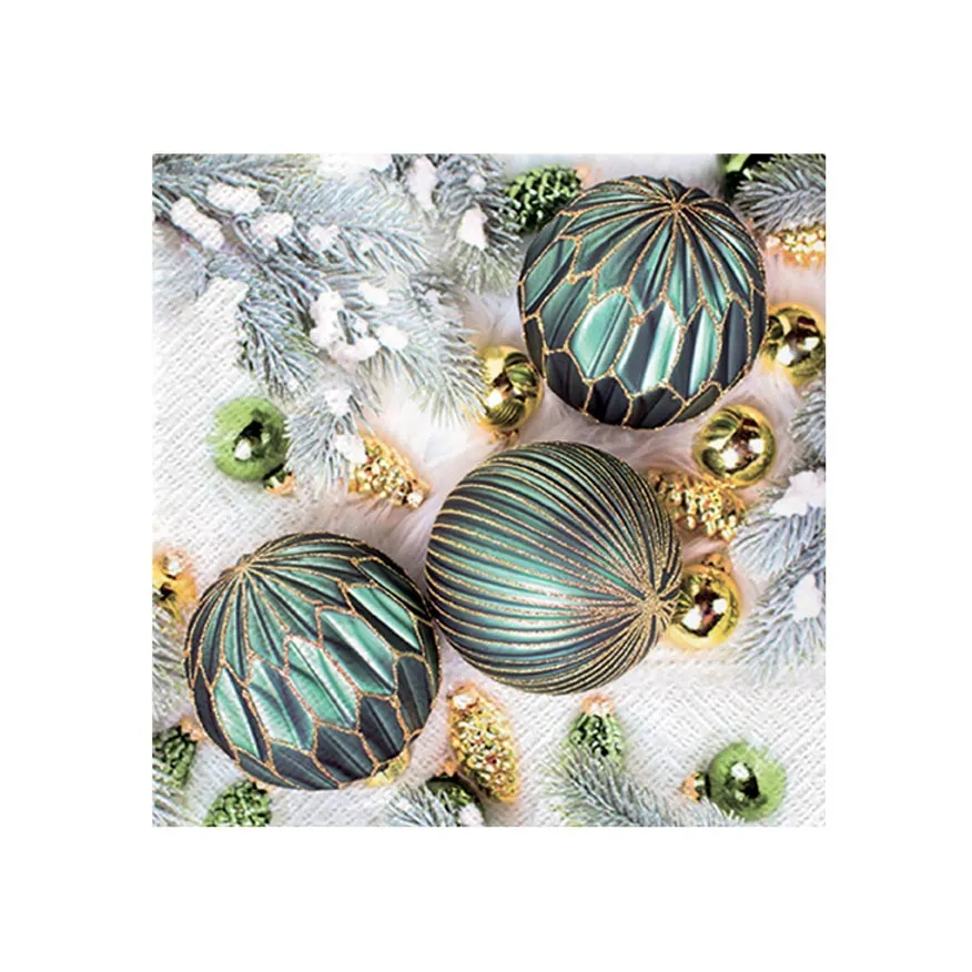 Dopřejte svému stolu slavnostní vzhled. Tento ubrousek zdobí tmavě zelené kouličky se zlatými detaily, doplněné o lesklé ozdoby, šišky a zasněžené větvičky jehličí. Kombinace zelené a zlaté působí luxusně a podtrhne výjimečnou atmosféru vánočních svátků.