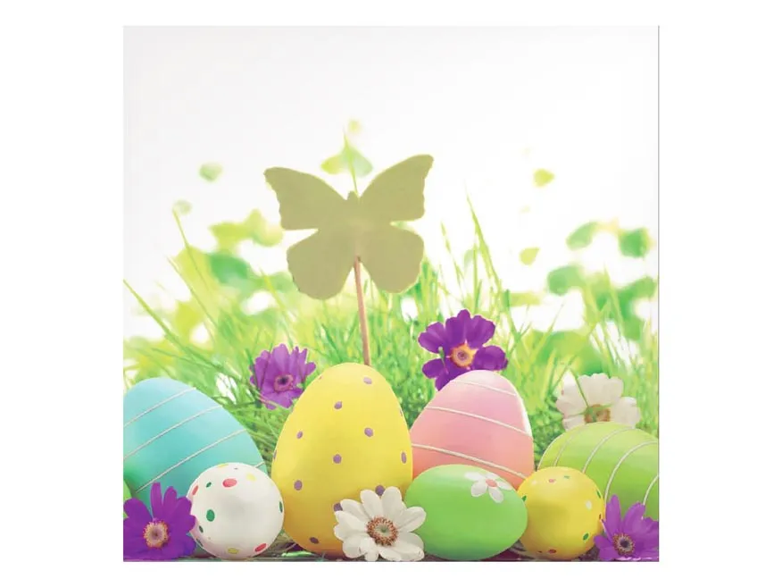 Motiv ubrousku představuje hravou jarní scénu s pastelově zdobenými vajíčky, rozkvetlými kvítky a zlatým motýlem na trávníku, která