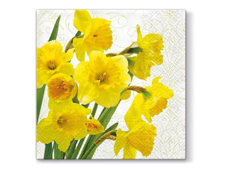 Rozjasněte svůj stůl tímto ubrouskem s motivem sytě žlutých narcisů, které symbolizují příchod jara a nový začátek.