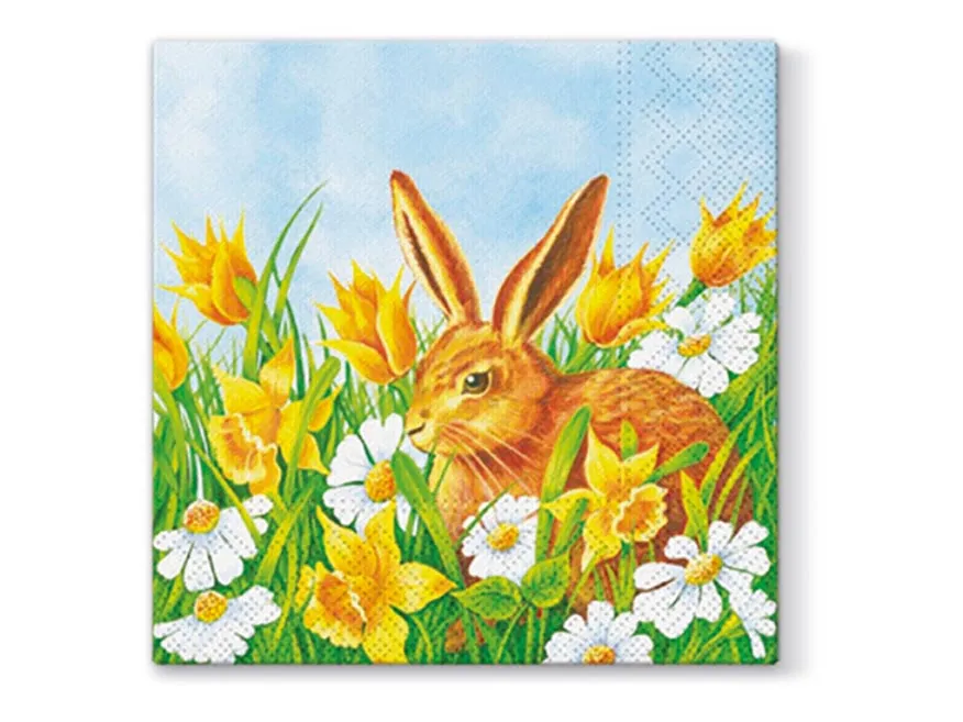Hledáte něco, co zachytí kouzlo jarní přírody? Tento ubrousek s roztomilým zajíčkem mezi zářivými tulipány, narcisy a sedmikráskami přinese na váš