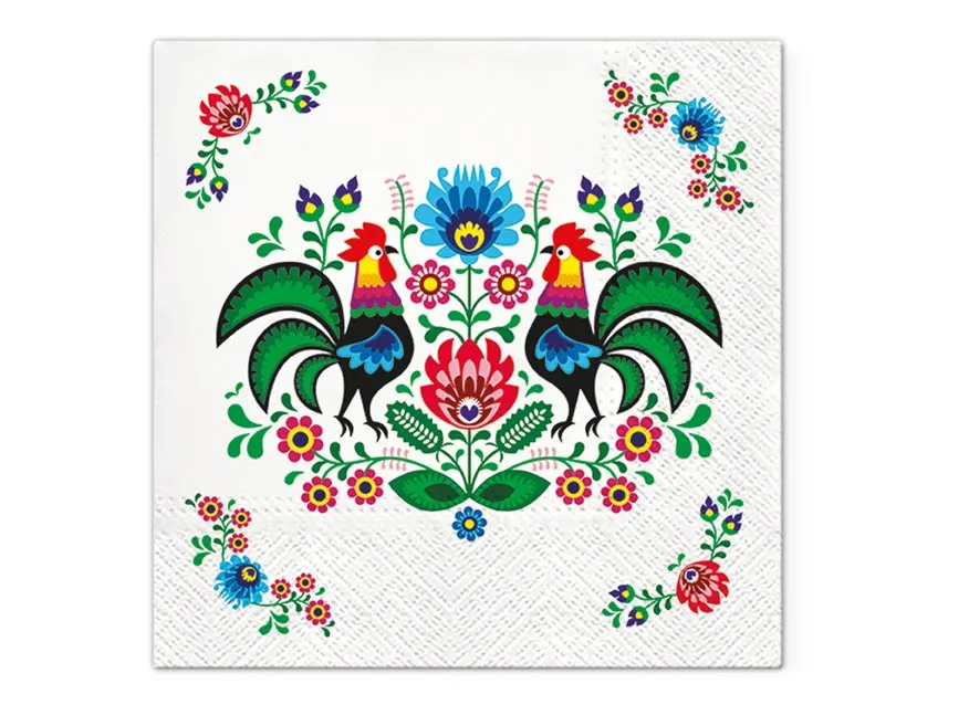 Vneste na svůj stůl kousek lidové tradice! Tento velikonoční ubrousek s barevnými kohoutky a pestrými květinovými vzory je ideální pro velikonoční stolování, jarní oslavy nebo jakékoli setkání, které chcete ozvláštnit