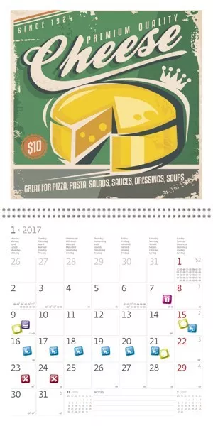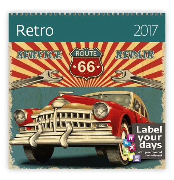 Nástěnný kalendář 2017 Helma, Retro LP16-17. Formát: 300x300mm (300x600mm), kalendárium: mezinárodní měsíční se svátky, 14 listů + více než 300 samolepek s piktogramy, twinová vazba, super tuhá lepenka, kalendárium v šesti jazycích (GB, D, F, I , NL, DK)