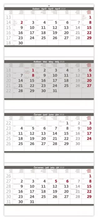Nástěnný kalendář 2018 HELMA Čtyřměsíční skládaný šedý N209. Formát: 315x450mm, prostor pro přítisk: 315x70mm, kalendárium: české čtyřměsíční se svátky vybraných evropských států, vazba: twin wire s očkem