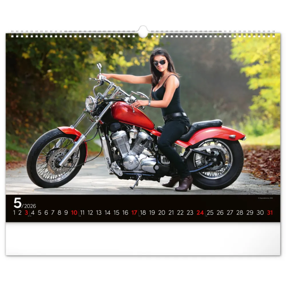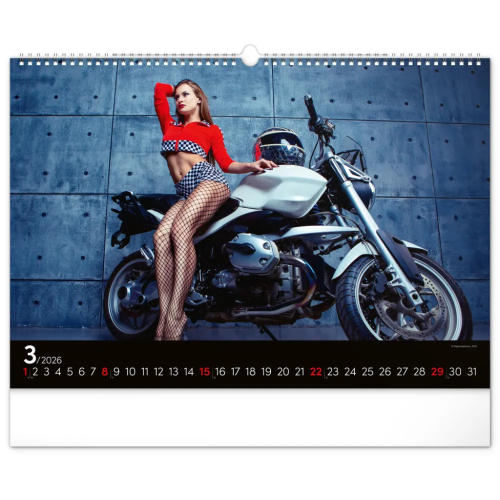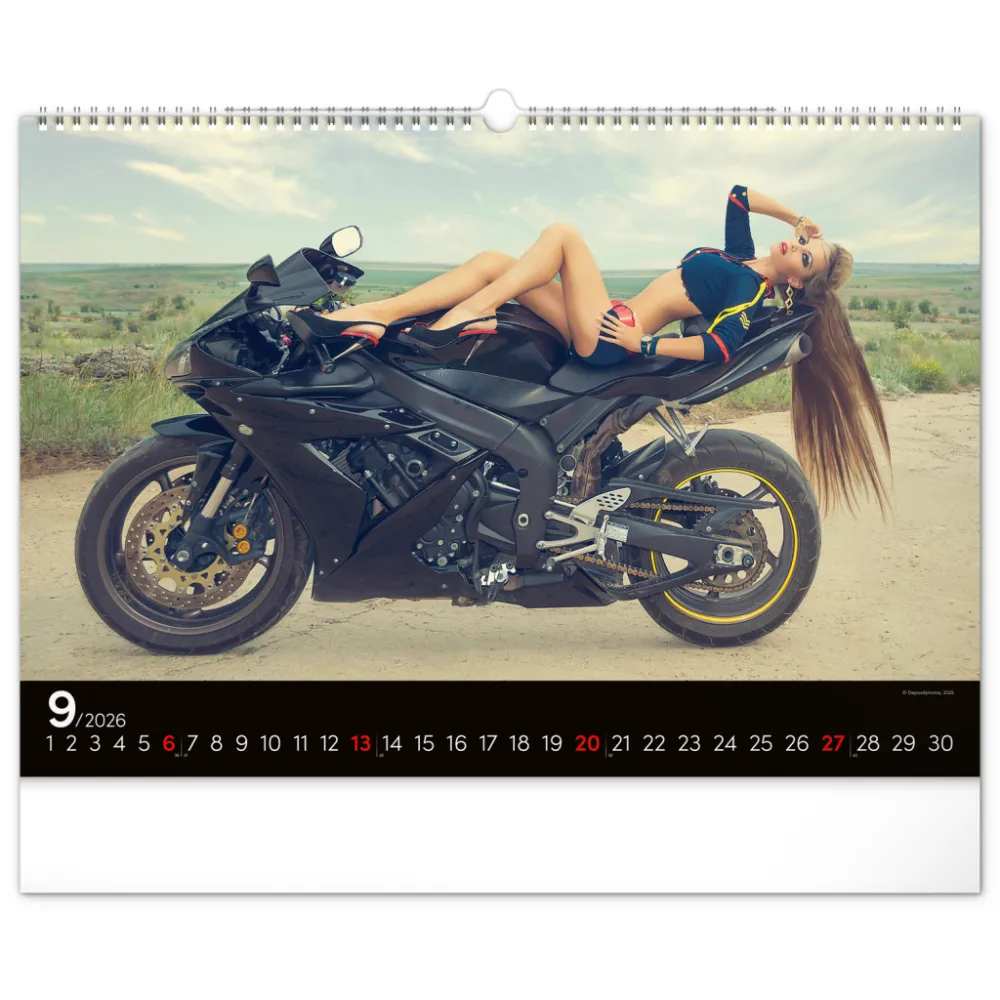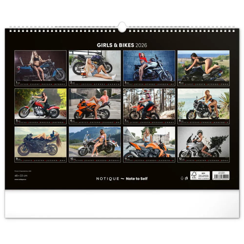 Nástěnný kalendář Girls & Bikes 2026, 48 x 33 cm. Kalendář pro milovníky žen a silných strojů. Na stránkách nástěnného kalendáře v šířkovém formátu pózuje dvanáct krásných žen s nablýskanými motocykly . Obsahuje univerzální kalendárium.