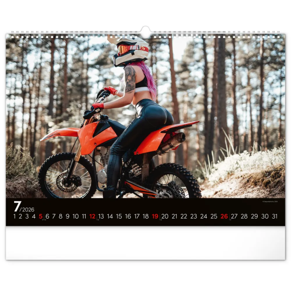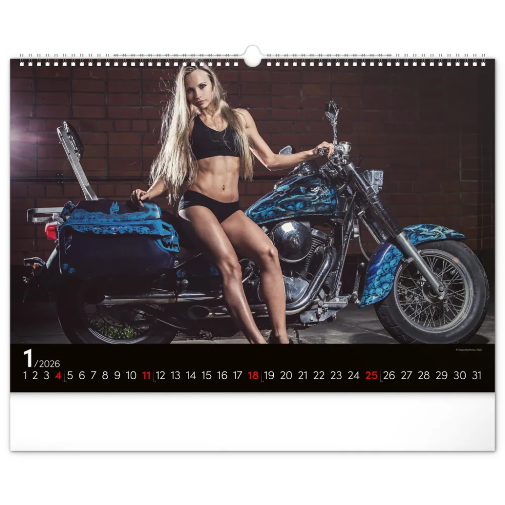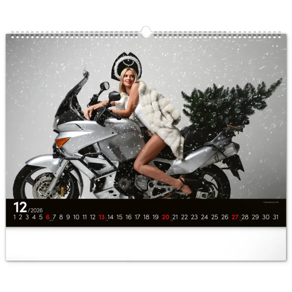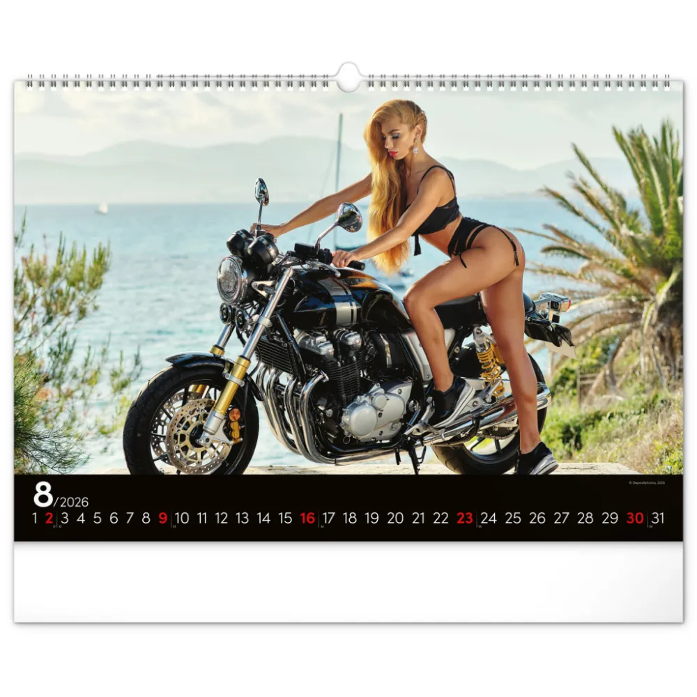 Nástěnný kalendář Girls & Bikes 2026, 48 x 33 cm. Kalendář pro milovníky žen a silných strojů. Na stránkách nástěnného kalendáře v šířkovém formátu pózuje dvanáct krásných žen s nablýskanými motocykly . Obsahuje univerzální kalendárium.