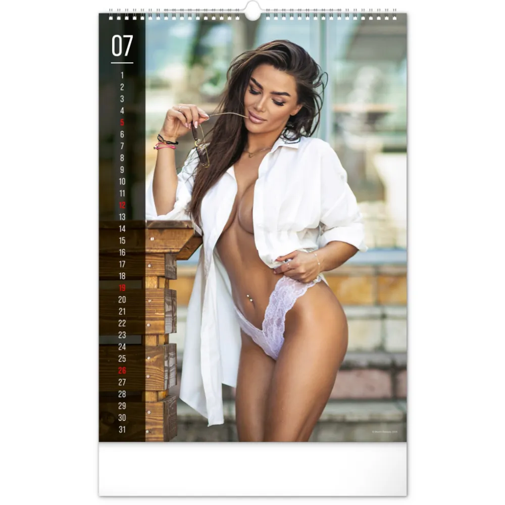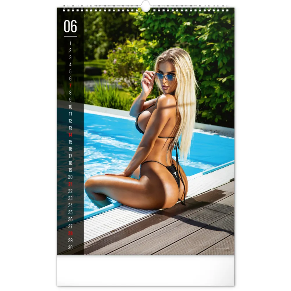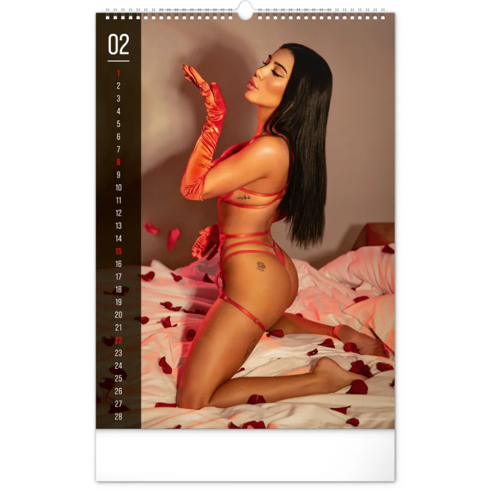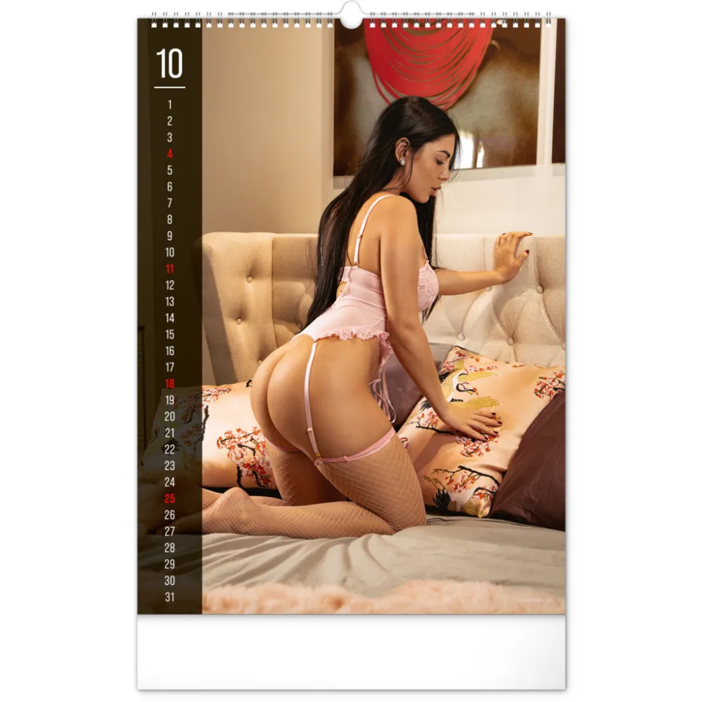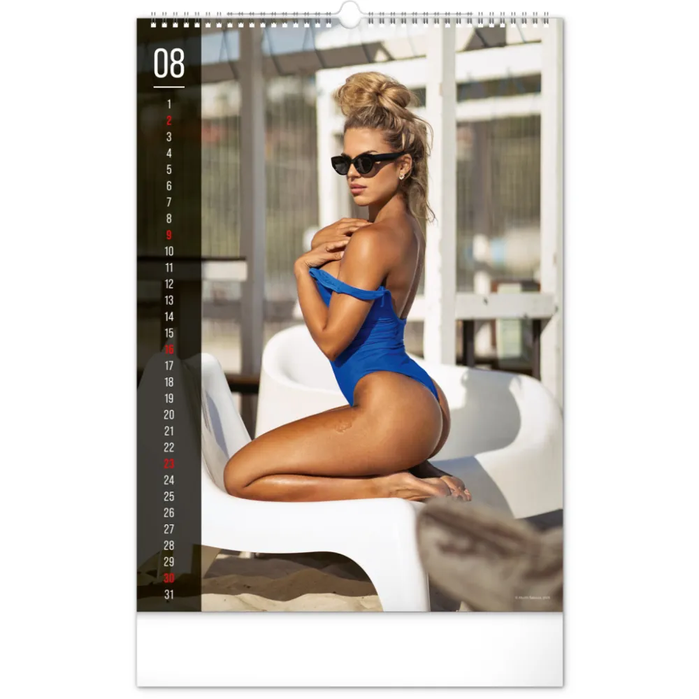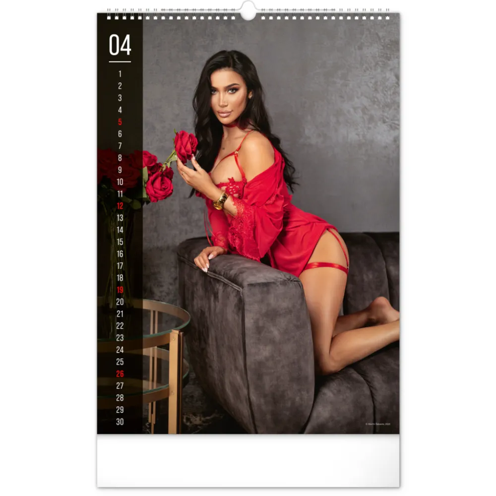Exkluzivní akty krásných žen. Kalendář obsahuje jednoduché kalendárium se zvýrazněnými nedělemi na černém pozadí.