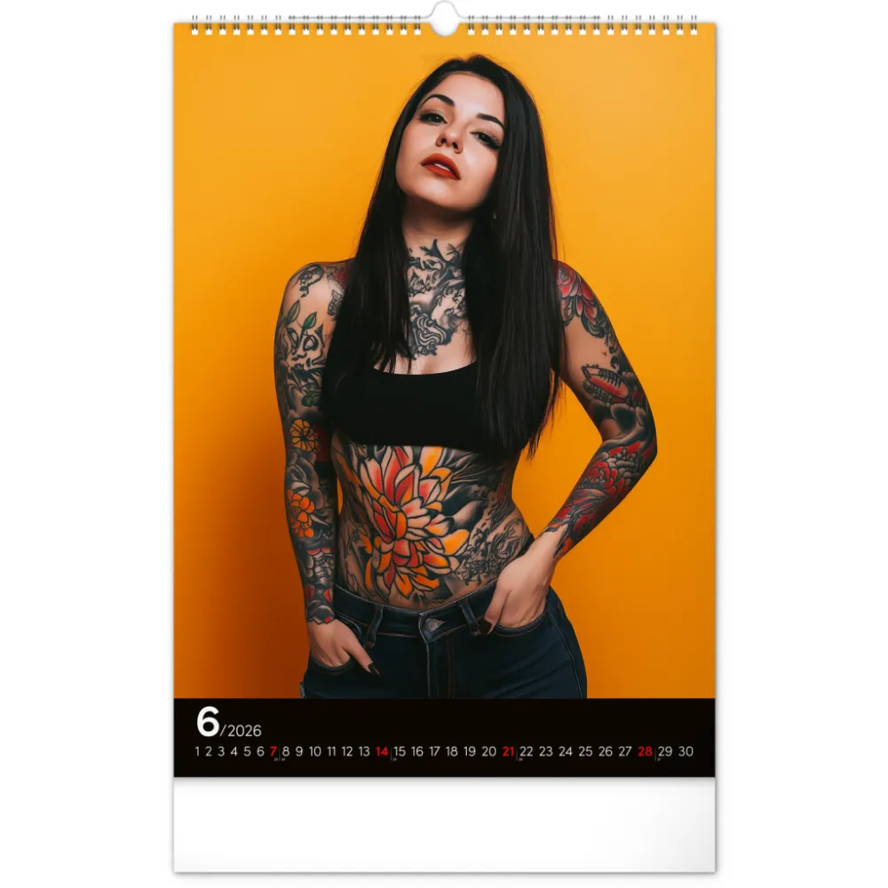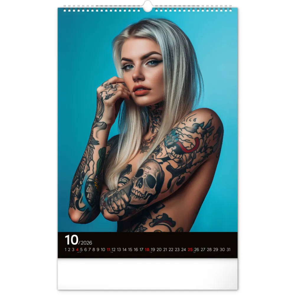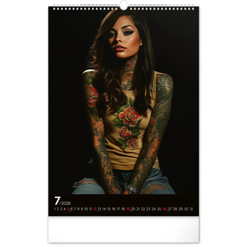 Rok plný charismatických žen a působivých tetování. Kalendář nabízí dvanáct fotografií modelek, které spojuje krása, styl a tělo proměněné v umělecké dílo. Nechybí jednoduché kalendárium se zvýrazněnými nedělemi na černém pozadí.