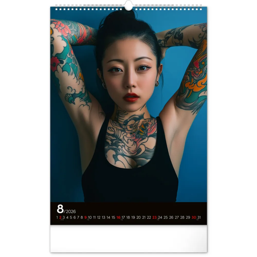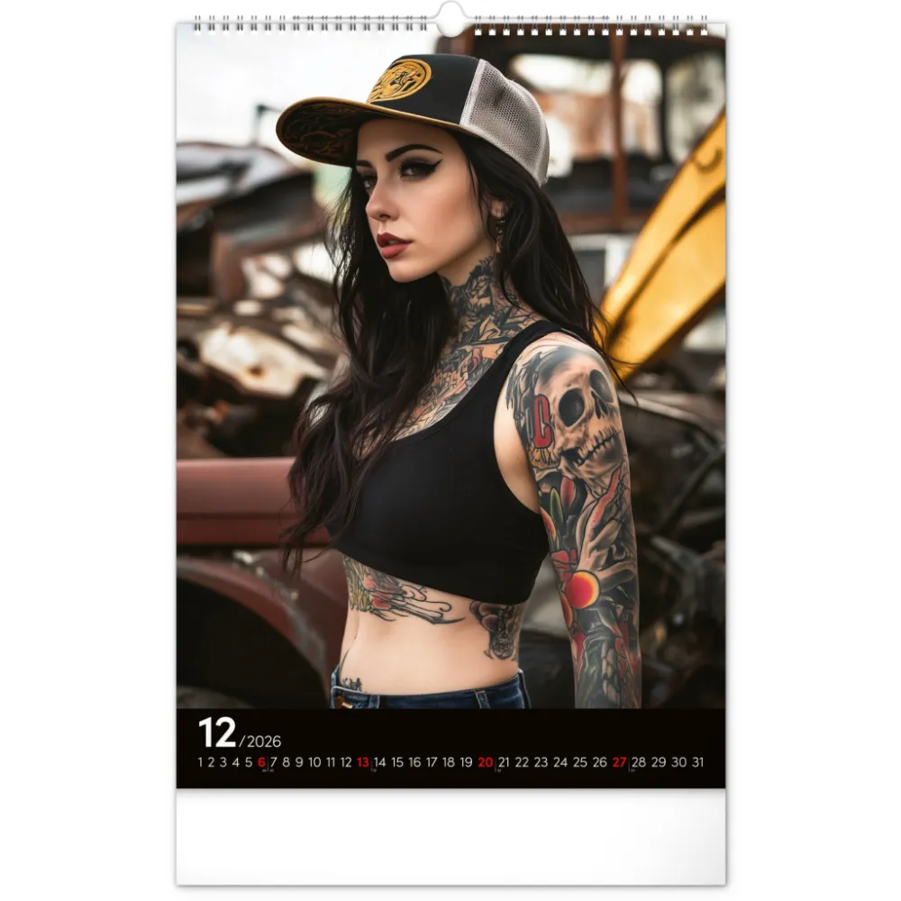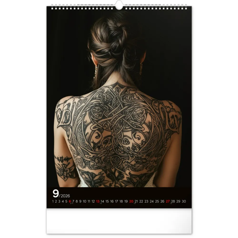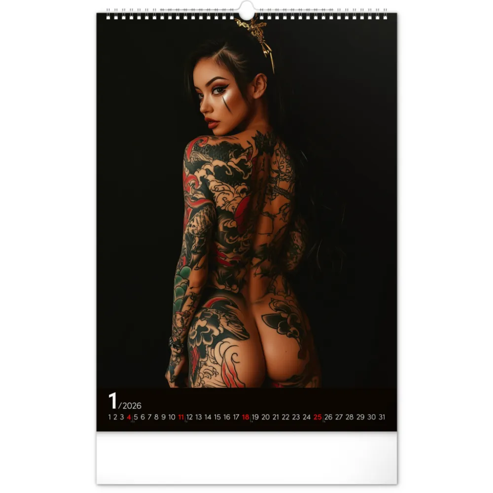 Rok plný charismatických žen a působivých tetování. Kalendář nabízí dvanáct fotografií modelek, které spojuje krása, styl a tělo proměněné v umělecké dílo. Nechybí jednoduché kalendárium se zvýrazněnými nedělemi na černém pozadí.