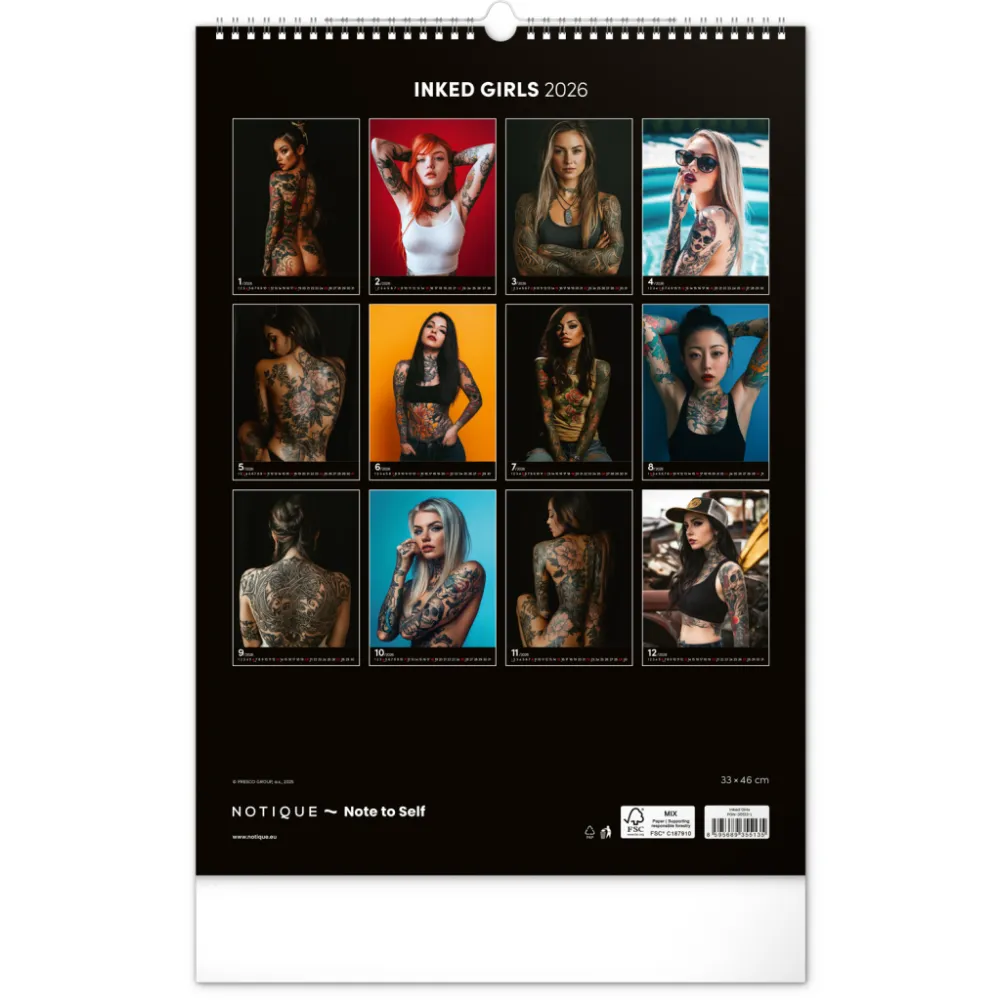 Nástěnný kalendář Inked Girls 2026, 33 x 46 cm. Rok plný charismatických žen a působivých tetování. Kalendář nabízí dvanáct fotografií modelek, které spojuje krása, styl a tělo proměněné v umělecké dílo. Nechybí jednoduché kalendárium se zvýrazněnými nedělemi na černém pozadí.