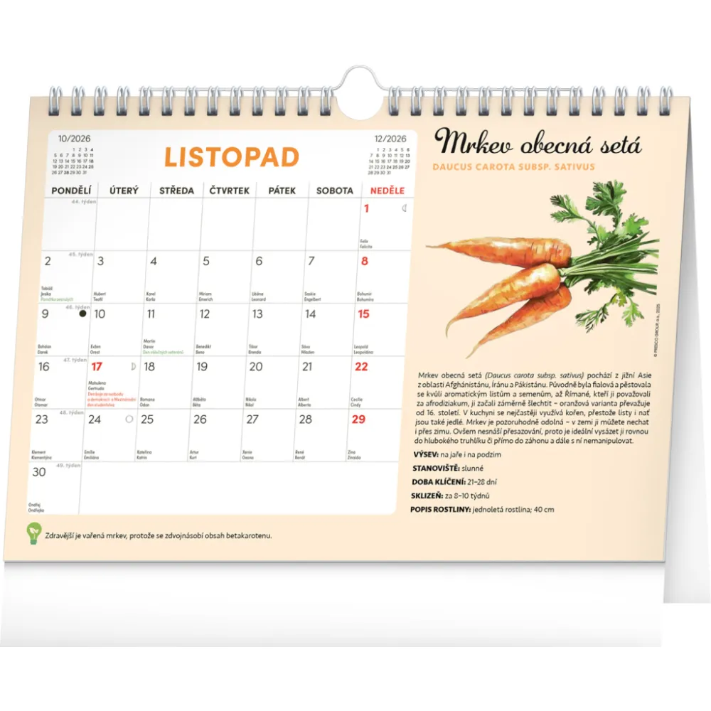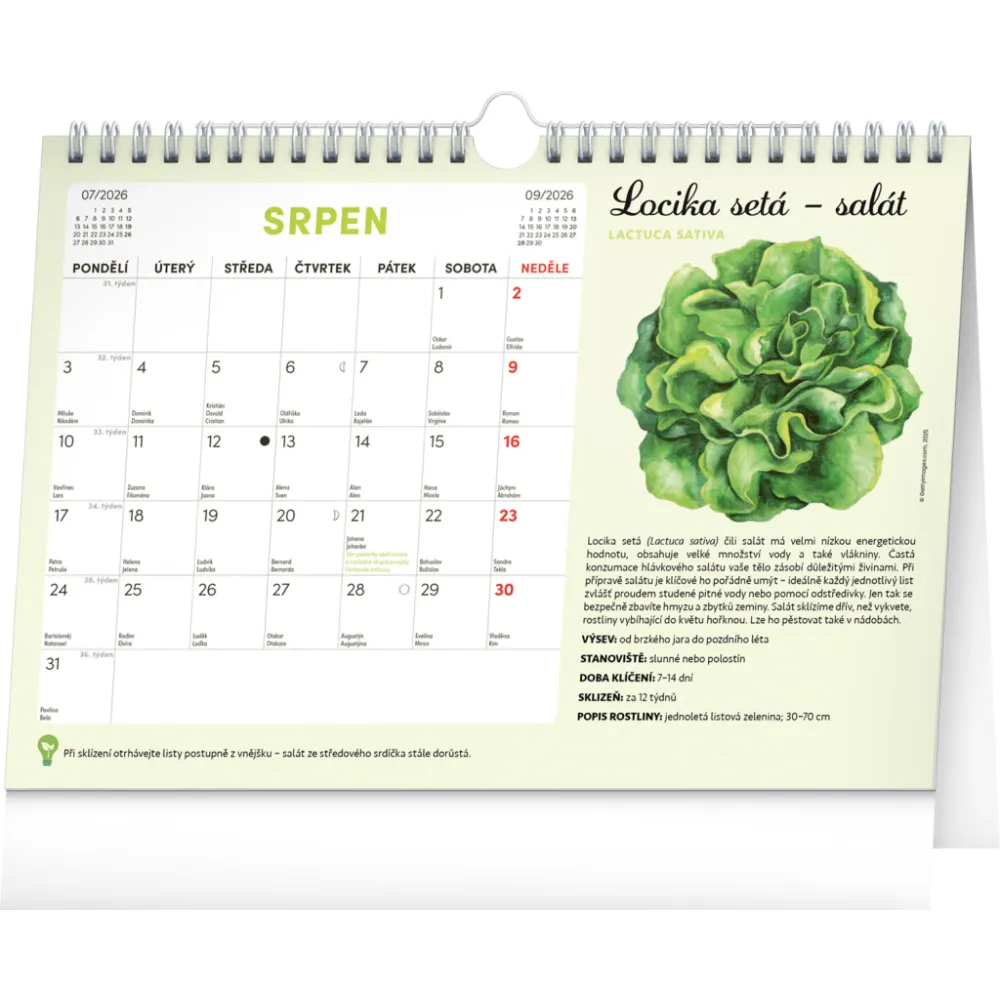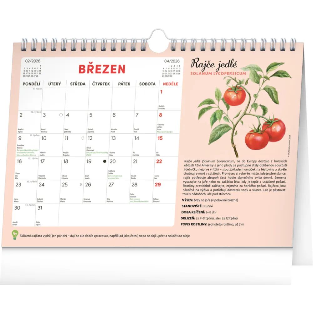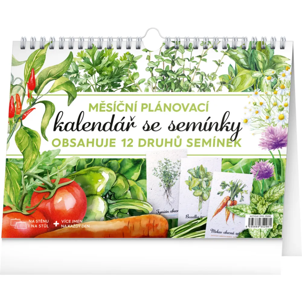 Objevte jedinečný stolní kalendář, který vám každý měsíc nabídne nejen dostatek prostoru na poznámky, ale i semínka rostlin, jež si můžete snadno vypěstovat doma. Stačí zasadit speciální semínkový papír do hlíny, zalévat a sledovat, jak vám rostou rajčata, bazalka, meduňka a další bylinky či zelenina. Ideální pro všechny, kteří chtějí zažít radost z pěstování a mít kousek zahrádky přímo u sebe doma. Obahuje měsíční kalendárium s českými svátky a jmeninami a 12 archů speciálního papíru se semínky.