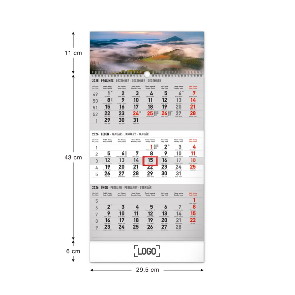 Detailní popis: NOTIQUE Nástěnný kalendář 3měsíční Krajina šedý – s českými jmény 2026, 29,5 x 43 cm