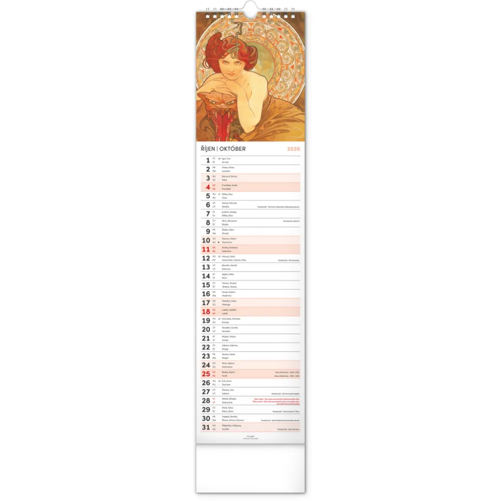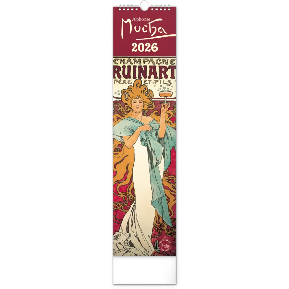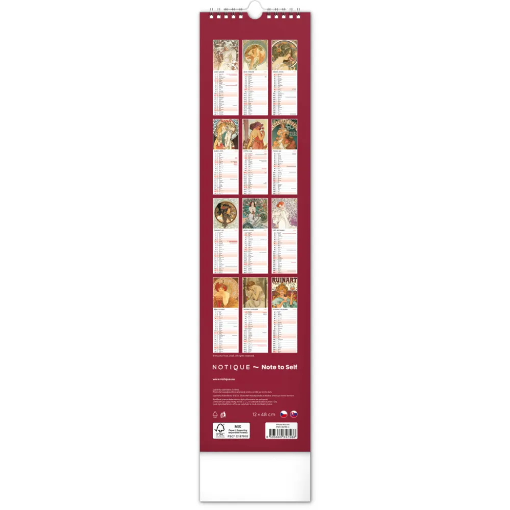 NOTIQUE Nástěnný kalendář Alfons Mucha 2026, 12 x 48 cm. Česko-slovenský nástěnný kalendář v kravatovém formátu s reprodukcemi obrazů oblíbeného secesního malíře českého původu.