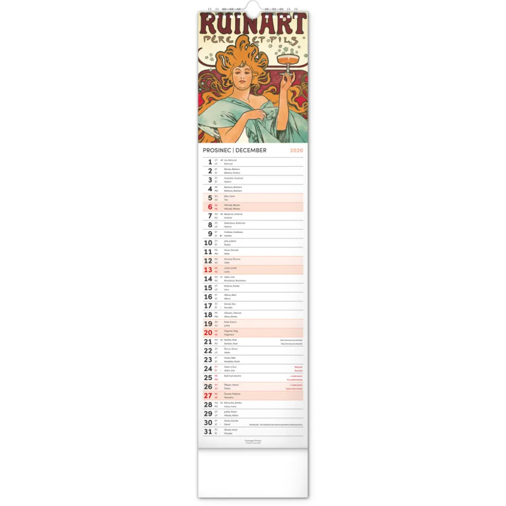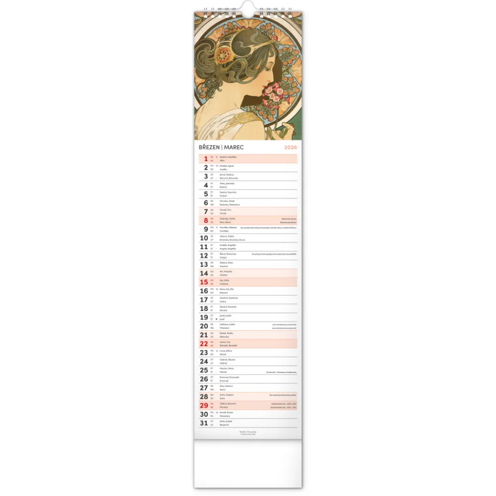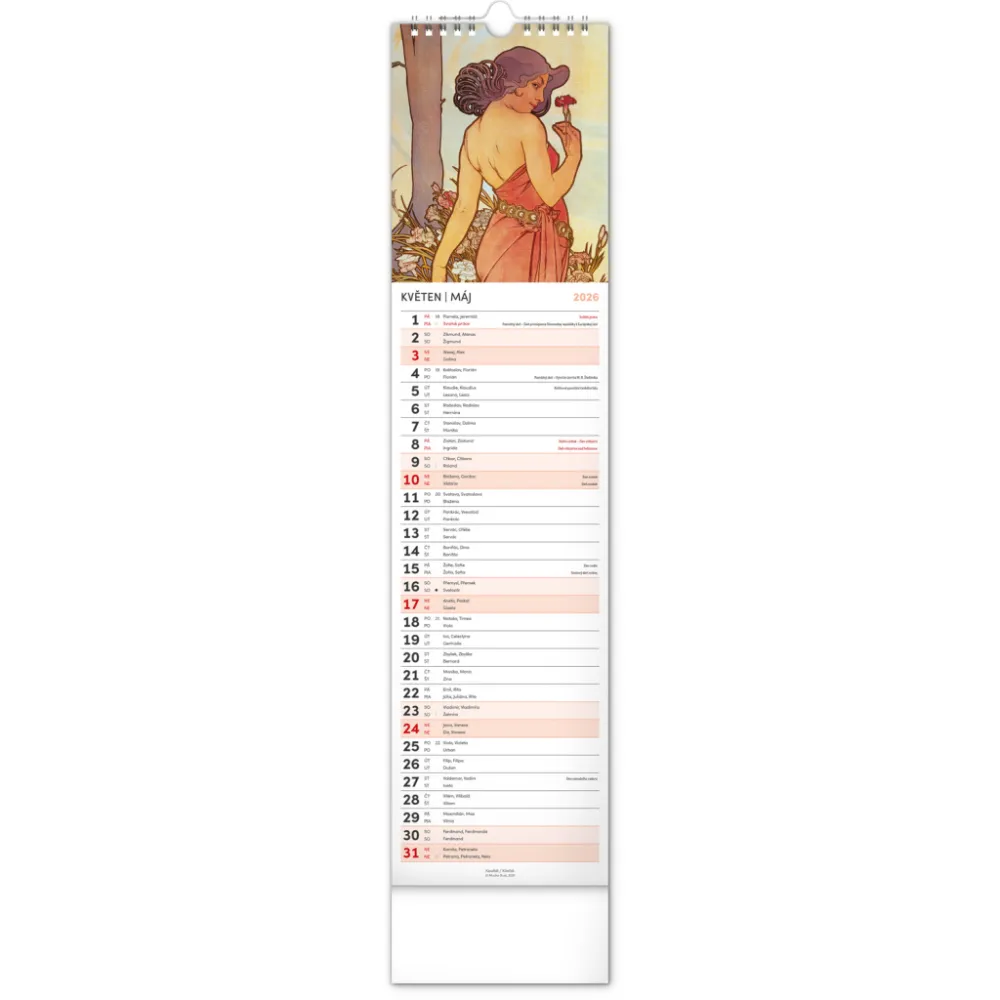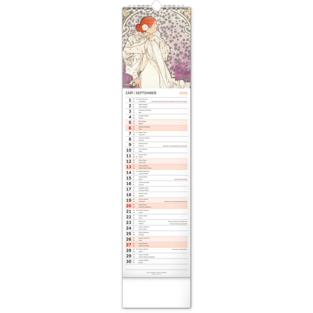 NOTIQUE Nástěnný kalendář Alfons Mucha 2026, 12 x 48 cm. Česko-slovenský nástěnný kalendář v kravatovém formátu s reprodukcemi obrazů oblíbeného secesního malíře českého původu.