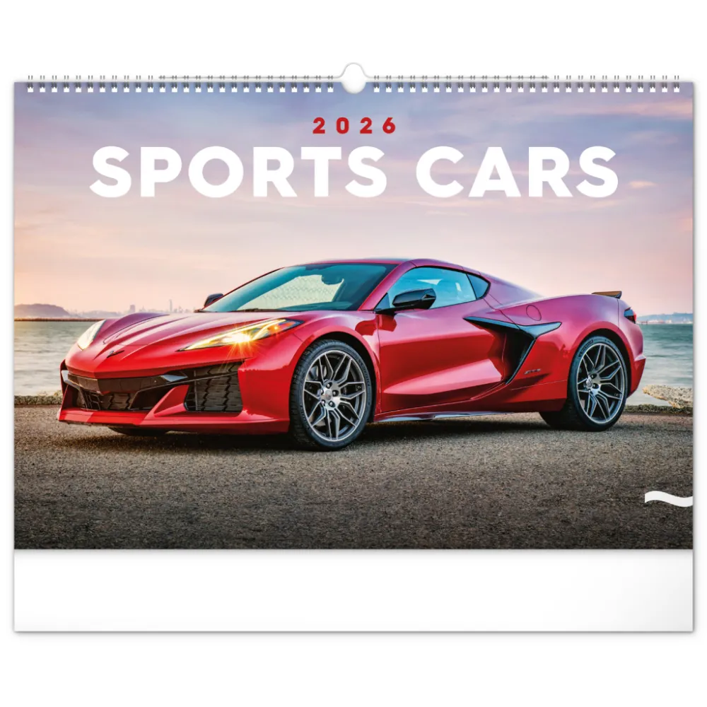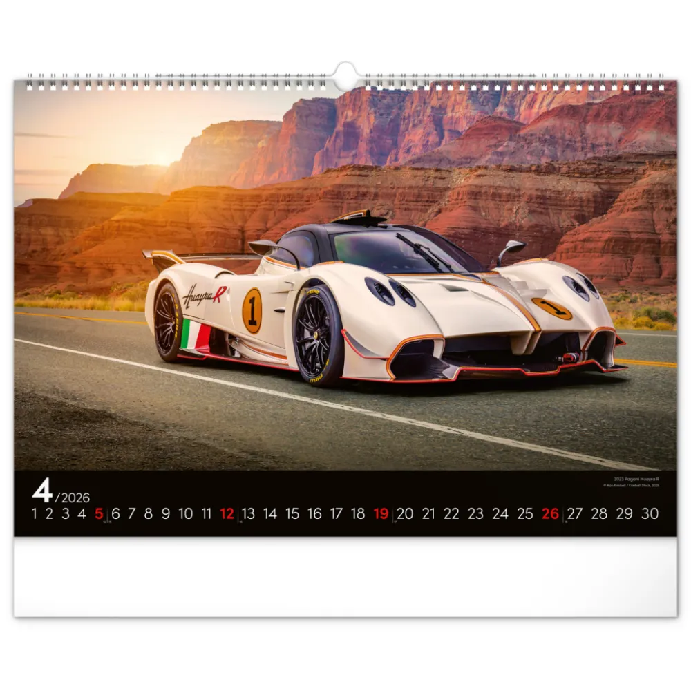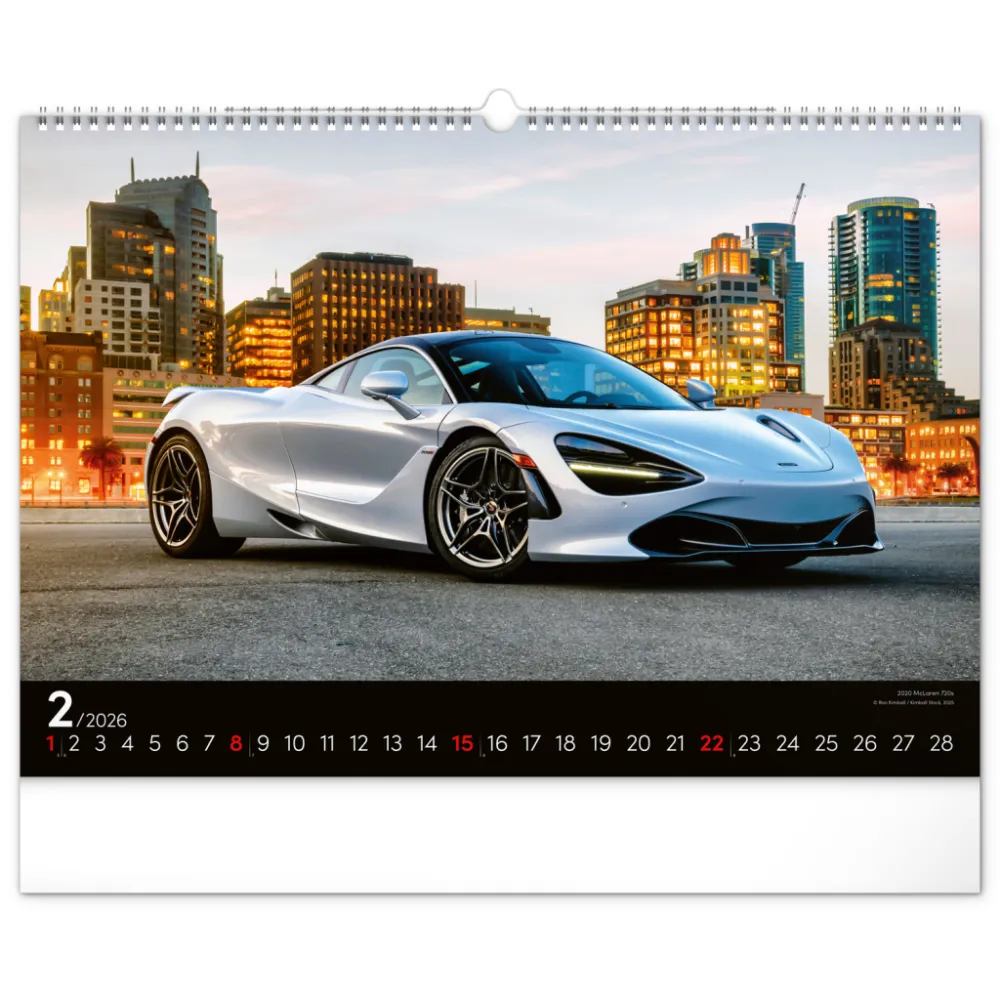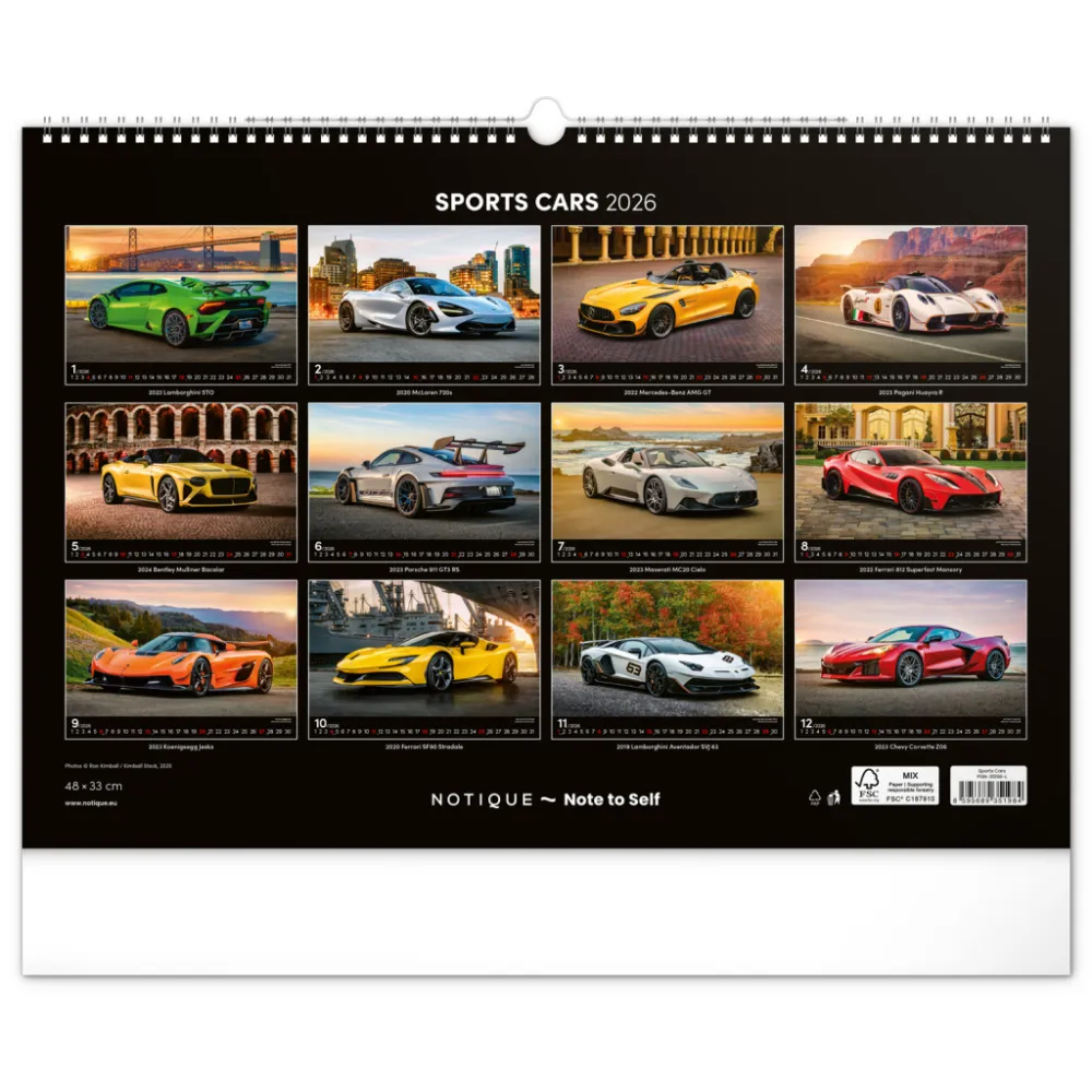 NOTIQUE Nástěnný kalendář Auta 2026, 48 x 33 cm. Nástěnný kalendář pro všechny milovníky rychlé jízdy a sportovních vozů. Dvanáct snímků luxusních sportovních vozů z celého světa na stránkách kalendáře v šířkovém formátu. Fotografie jsou doplněny univerzálním kalendáriem na černém pozadí.