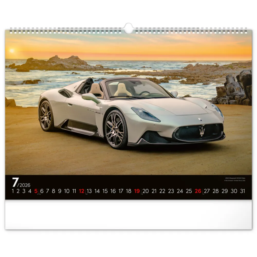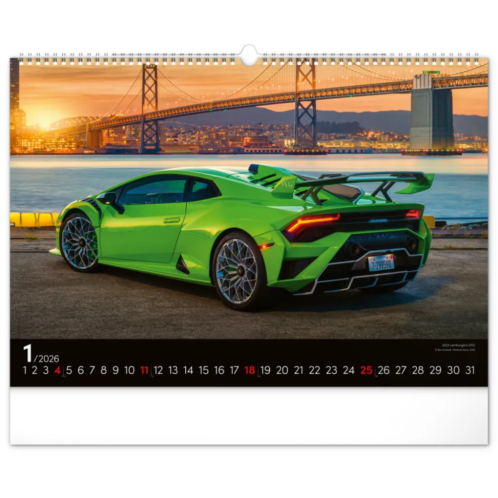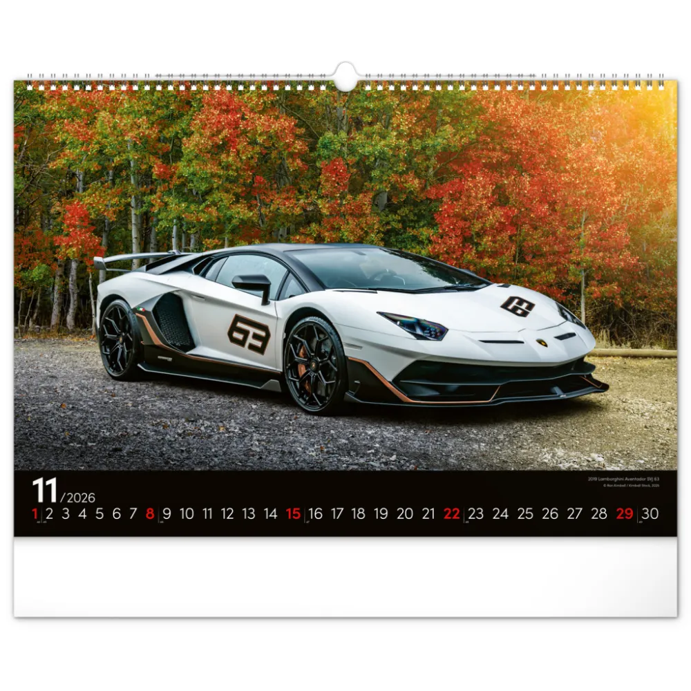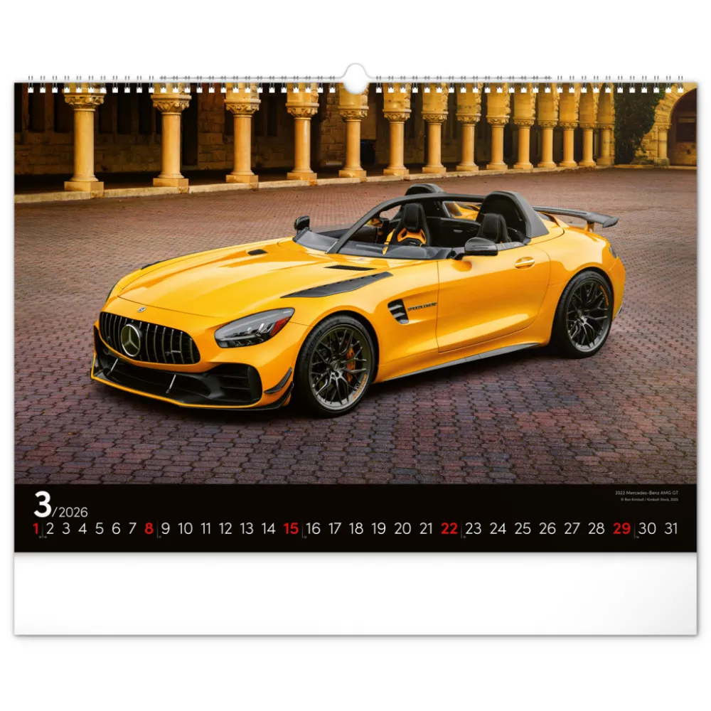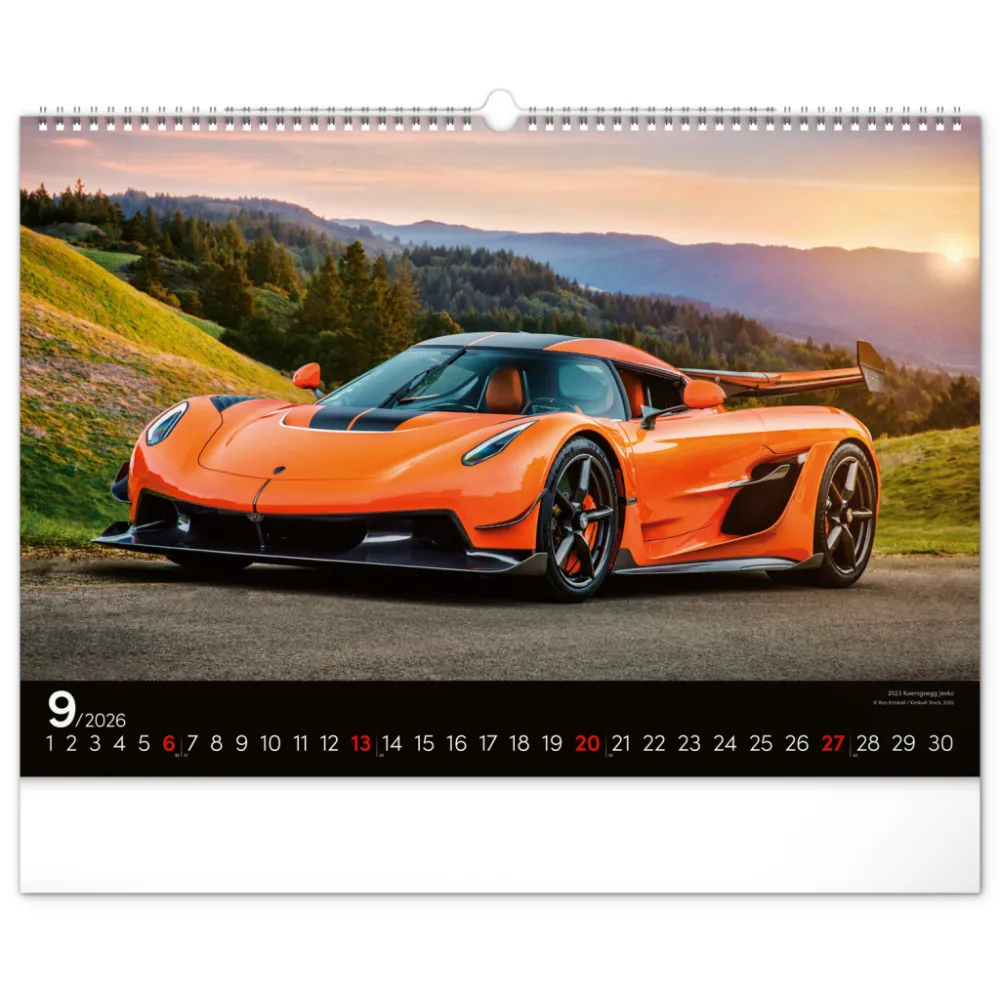 NOTIQUE Nástěnný kalendář Auta 2026, 48 x 33 cm. Nástěnný kalendář pro všechny milovníky rychlé jízdy a sportovních vozů. Dvanáct snímků luxusních sportovních vozů z celého světa na stránkách kalendáře v šířkovém formátu. Fotografie jsou doplněny univerzálním kalendáriem na černém pozadí.