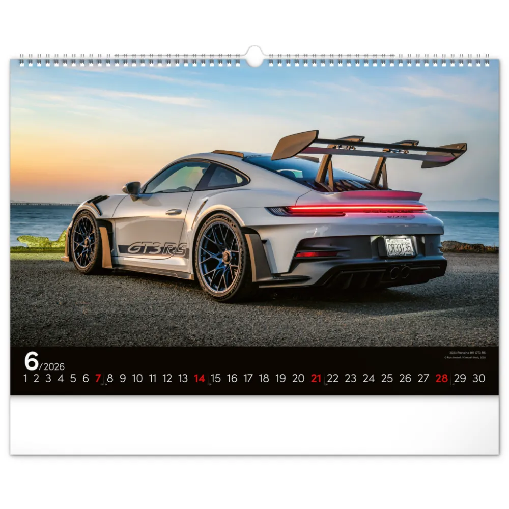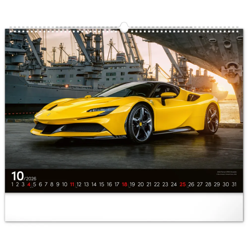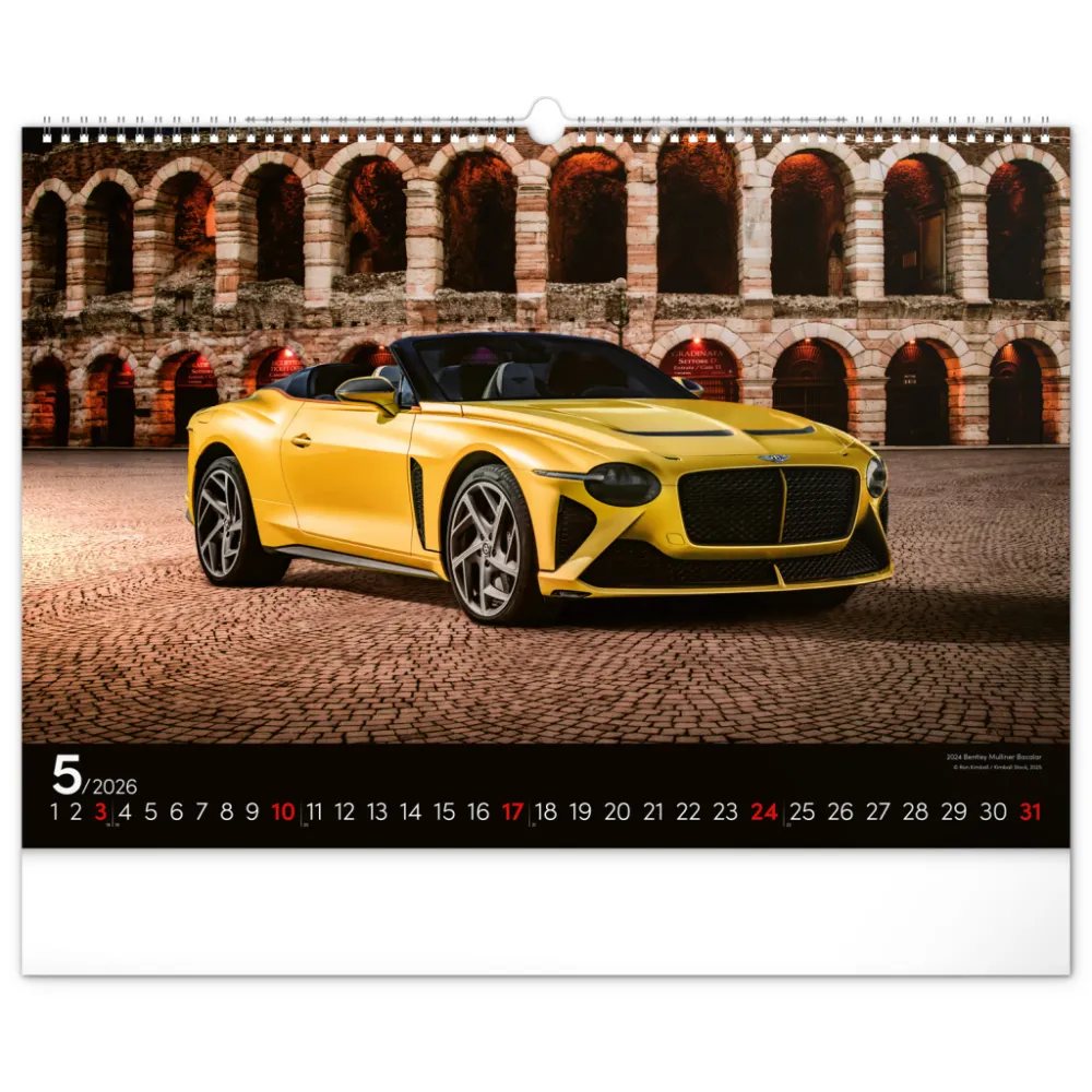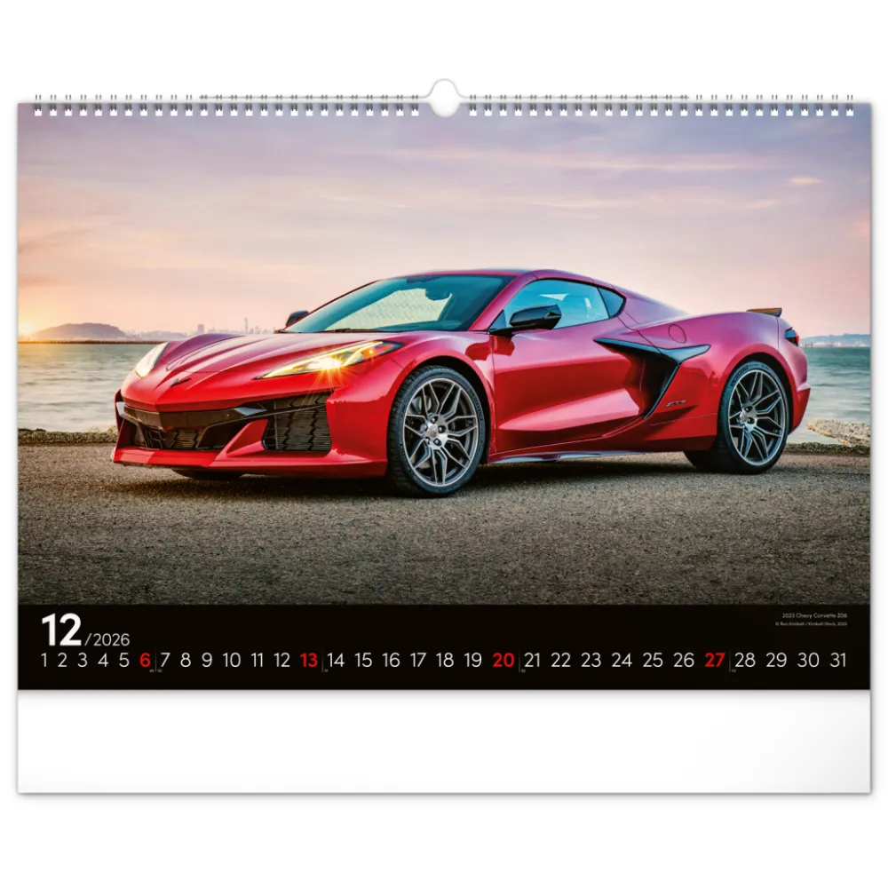 NOTIQUE Nástěnný kalendář Auta 2026, 48 x 33 cm. Nástěnný kalendář pro všechny milovníky rychlé jízdy a sportovních vozů. Dvanáct snímků luxusních sportovních vozů z celého světa na stránkách kalendáře v šířkovém formátu. Fotografie jsou doplněny univerzálním kalendáriem na černém pozadí.