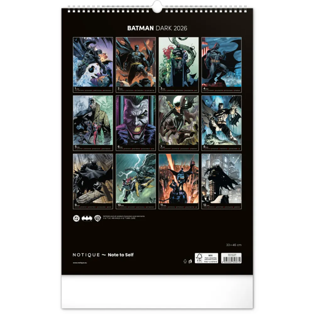 NOTIQUE Nástěnný kalendář Batman Dark 2026, 33 x 46 cm. Nástěnný kalendář s obrázky z komiksů Batman potěší každého fanouška Temného rytíře. Nabízí ikonické ilustrace hrdiny z Gothamu na každý měsíc roku. Kalendář je ideální jako dekorace do pokoje nebo kanceláře.