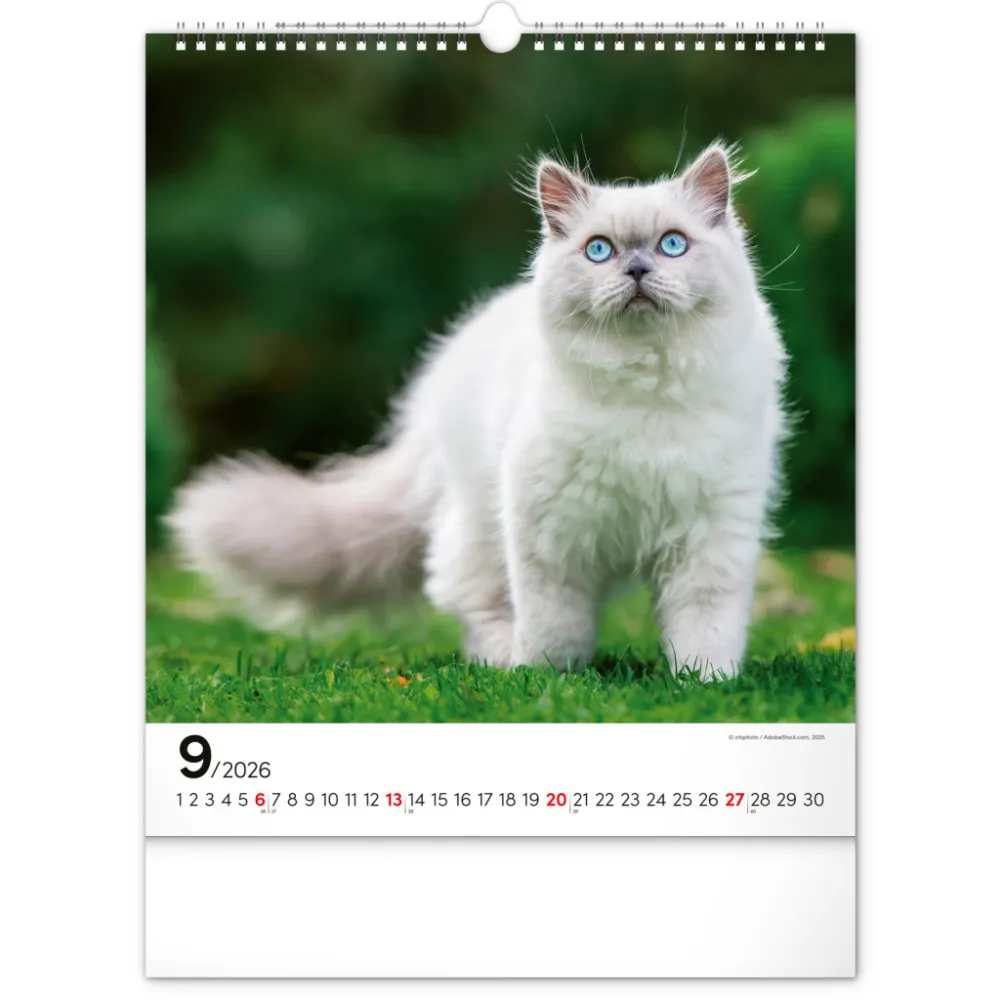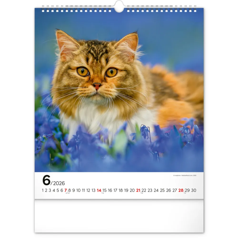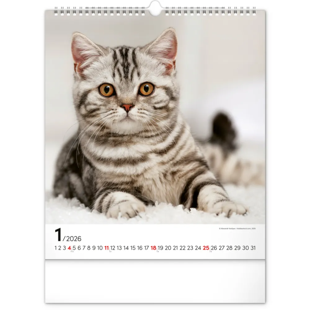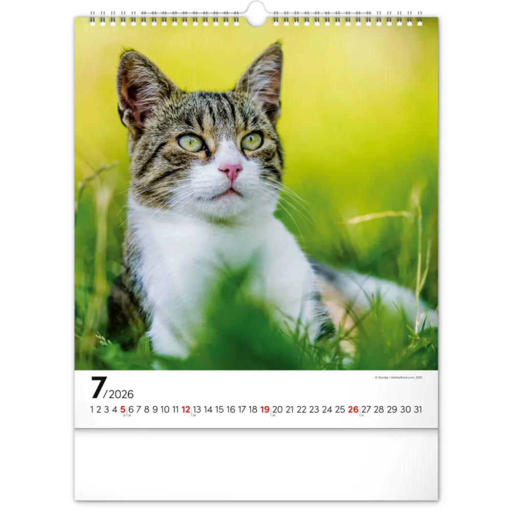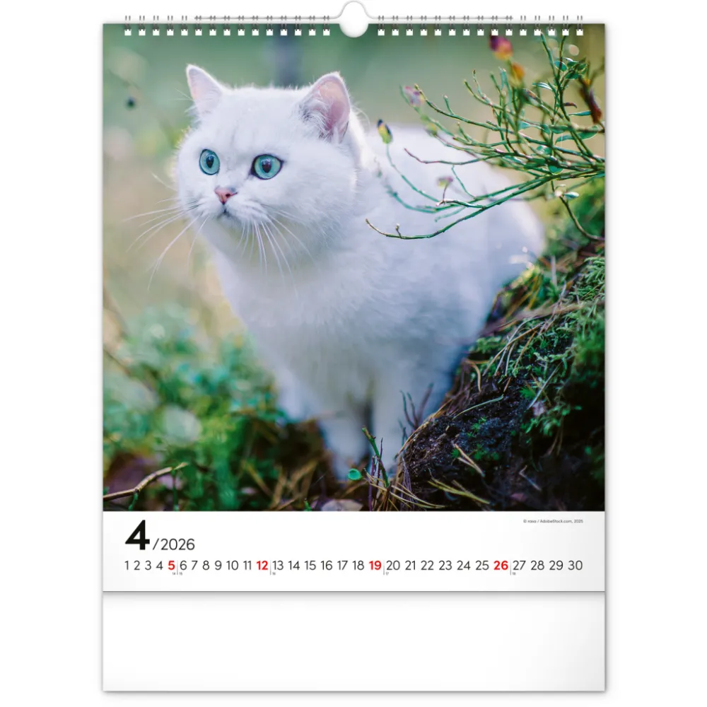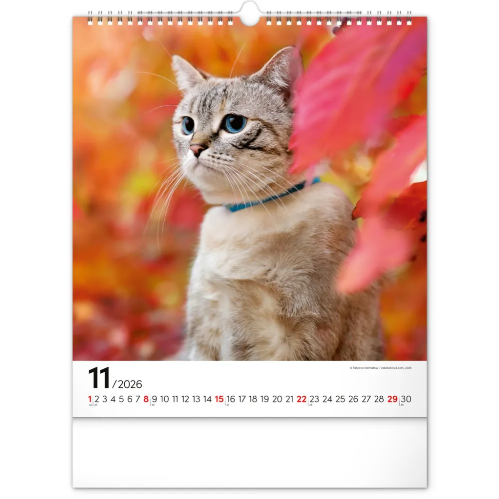 NOTIQUE Nástěnný kalendář Kočky 2026, 30 x 34 cm. Fotografie osobitých koček na stránkách oblíbeného nástěnného kalendáře s univerzálním kalendáriem na bílém pozadí.