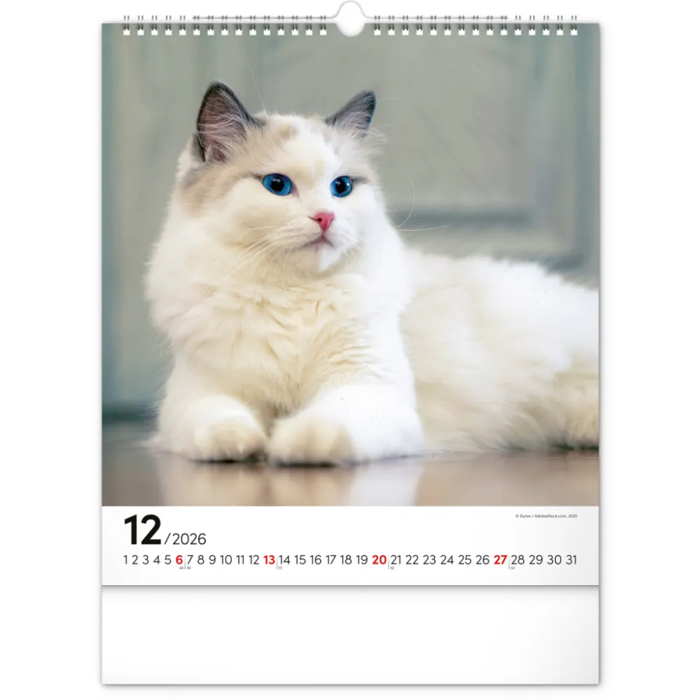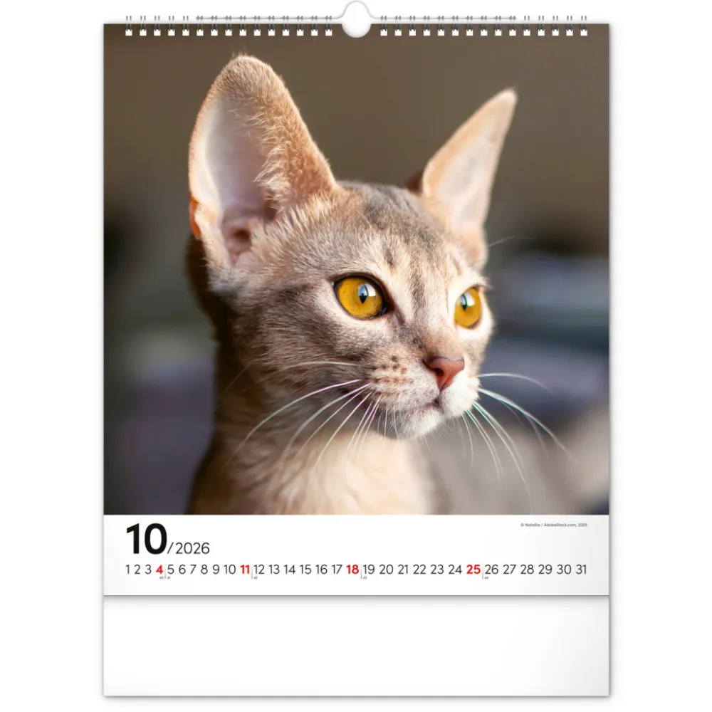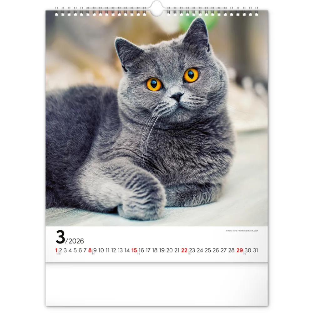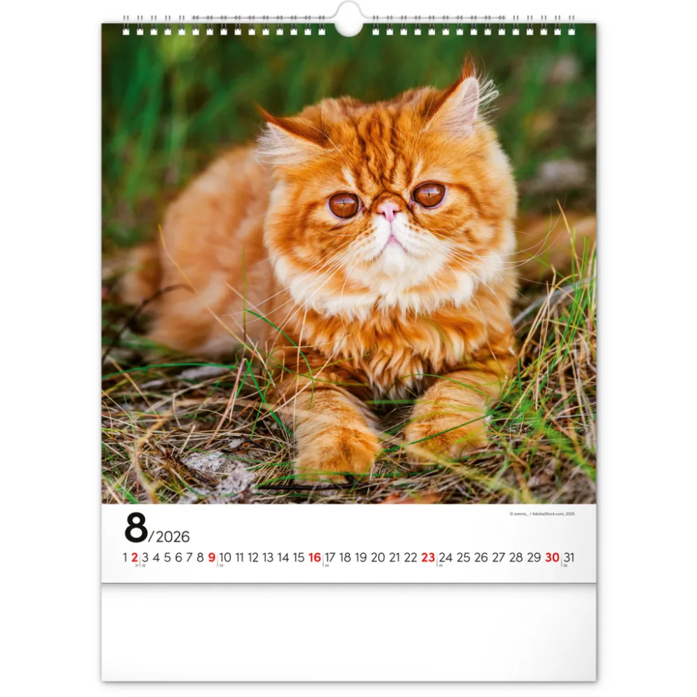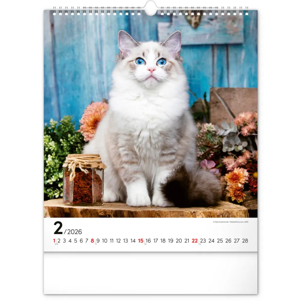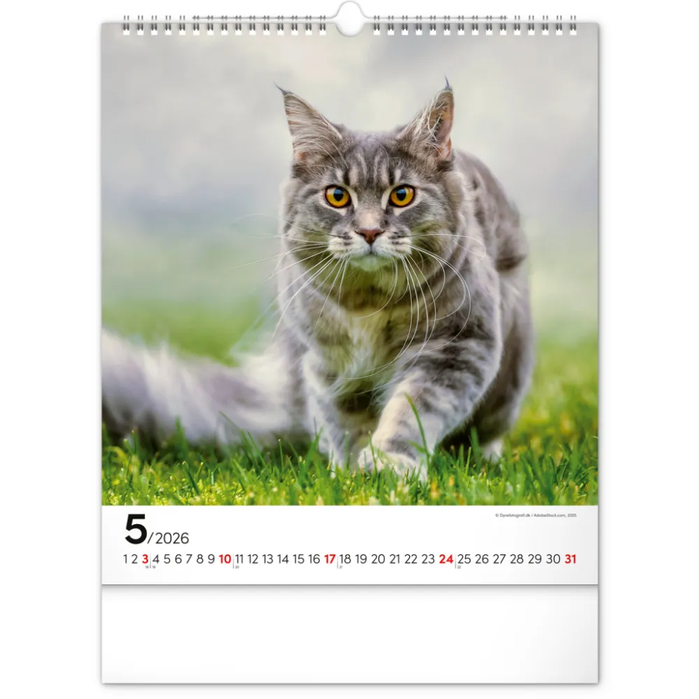 NOTIQUE Nástěnný kalendář Kočky 2026, 30 x 34 cm. Fotografie osobitých koček na stránkách oblíbeného nástěnného kalendáře s univerzálním kalendáriem na bílém pozadí.