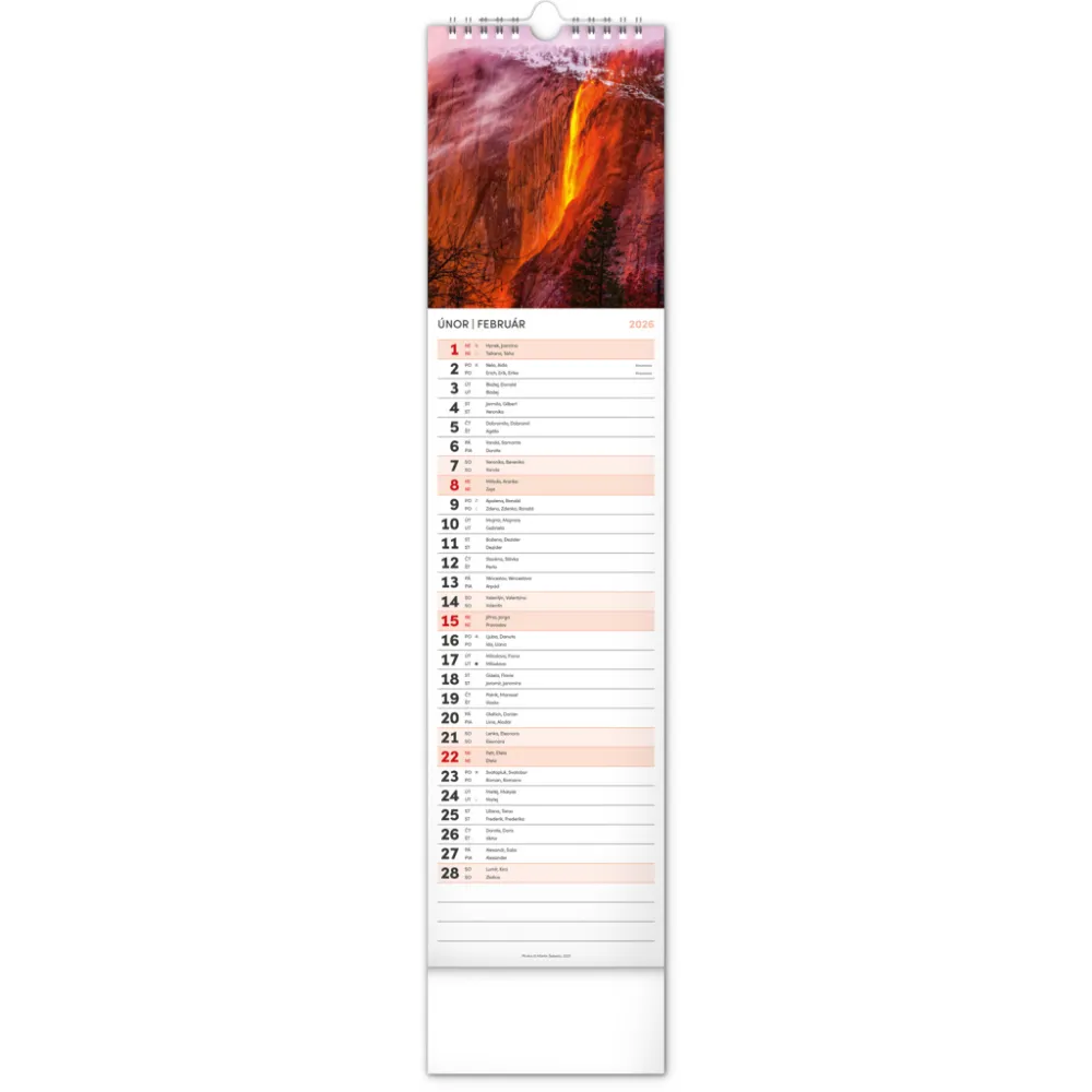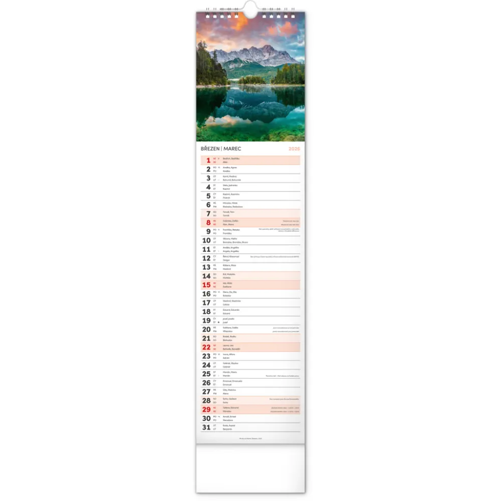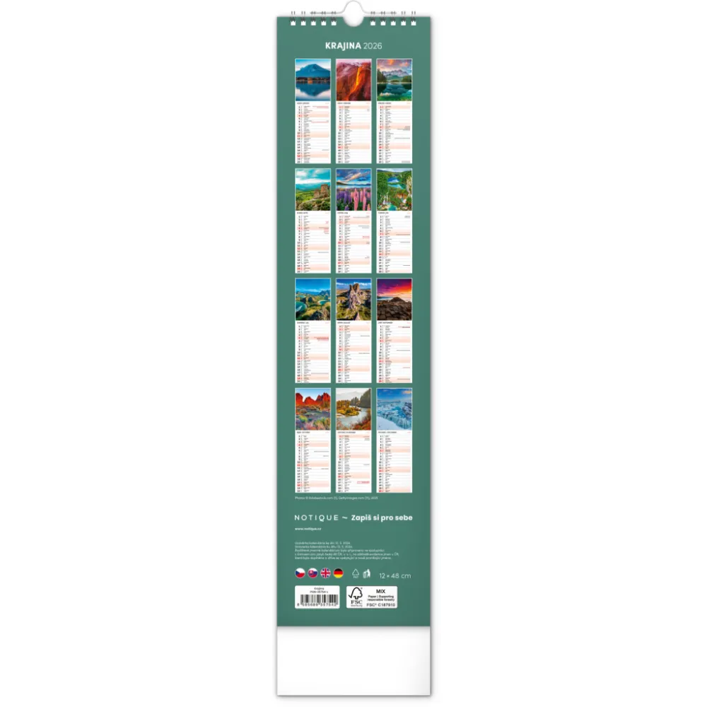 NOTIQUE Nástěnný kalendář Krajina 2026, 12 x 48 cm. Udělejte si radost pohledem na fotografie malebné krajiny v praktickém úzkém formátu česko-slovenského nástěnného kalendáře. Kalendář obsahuje česká a slovenská jména, svátky, památné dny i měsíční fáze. V každém jednotlivém dni je prostor pro poznámky.