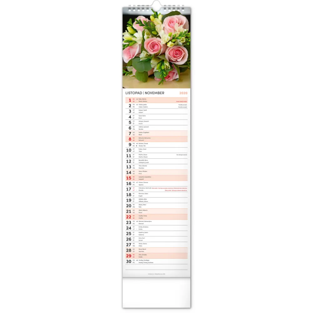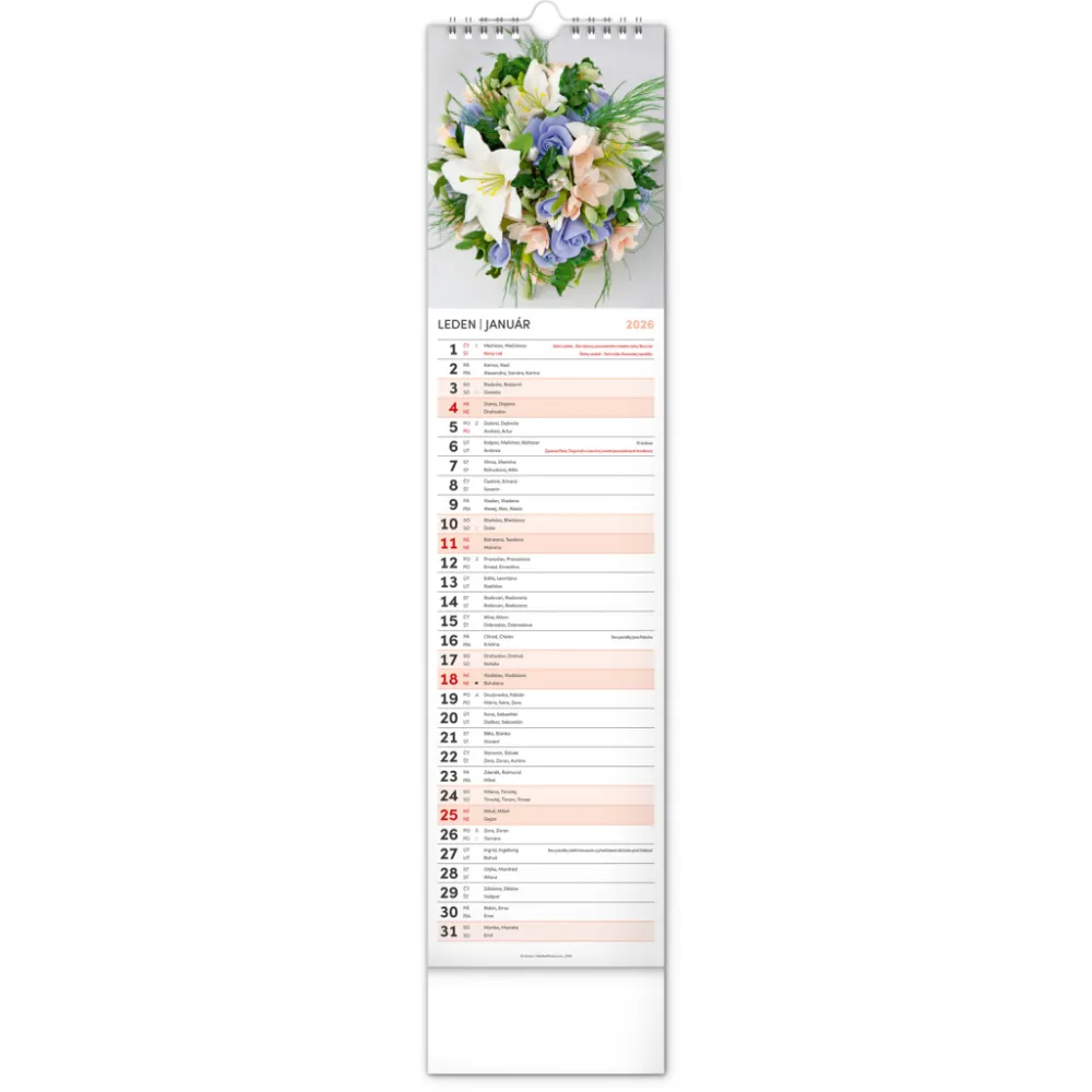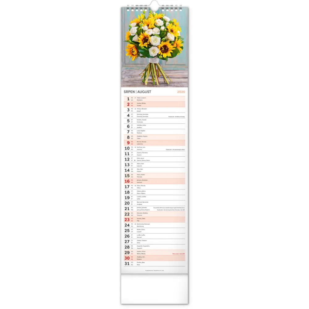 NOTIQUE Nástěnný kalendář Květiny – Kvety 2026, 12 x 48 cm. Okrasné květiny a květinová aranžmá na stránkách nástěnného kalendáře v praktickém kravatovém formátu, který se vejde opravdu všude. V česko-slovenském kalendáři je rovnocenně zahrnuta čeština a slovenština, česká a slovenská jména, svátky, památné ...