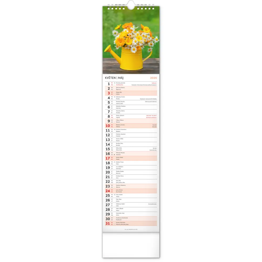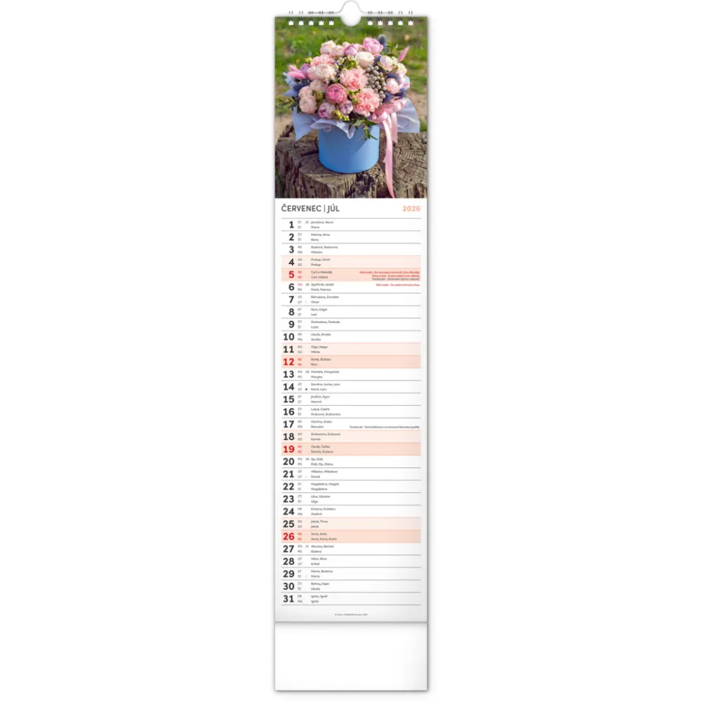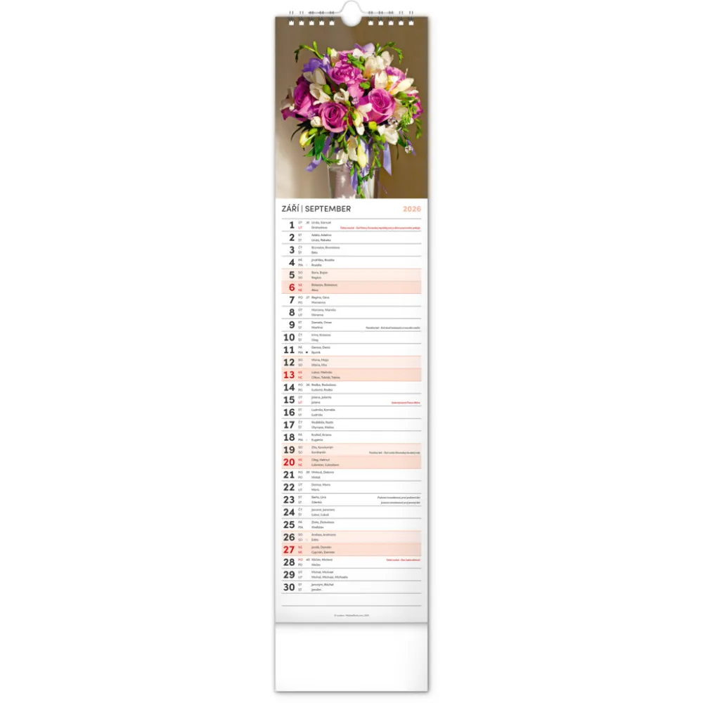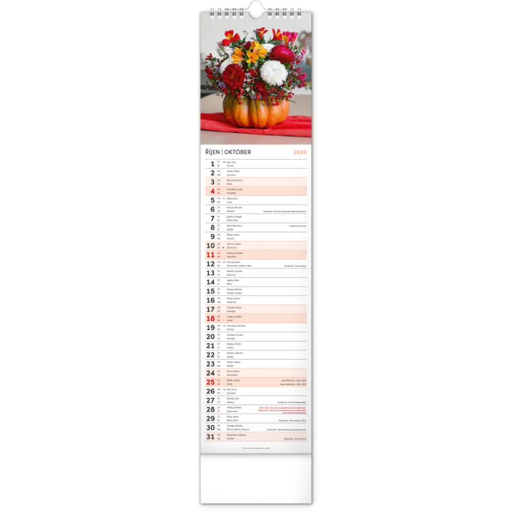 NOTIQUE Nástěnný kalendář Květiny – Kvety 2026, 12 x 48 cm. Okrasné květiny a květinová aranžmá na stránkách nástěnného kalendáře v praktickém kravatovém formátu, který se vejde opravdu všude. V česko-slovenském kalendáři je rovnocenně zahrnuta čeština a slovenština, česká a slovenská jména, svátky, památné ...