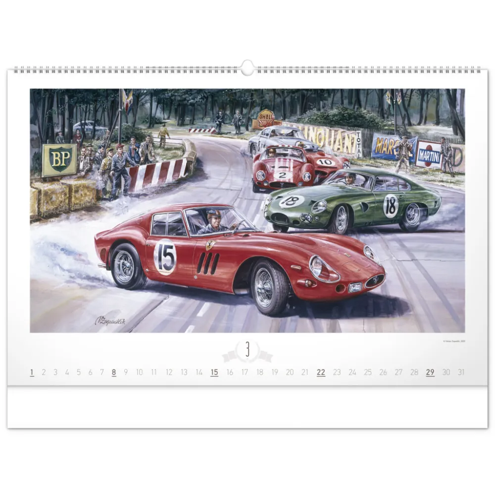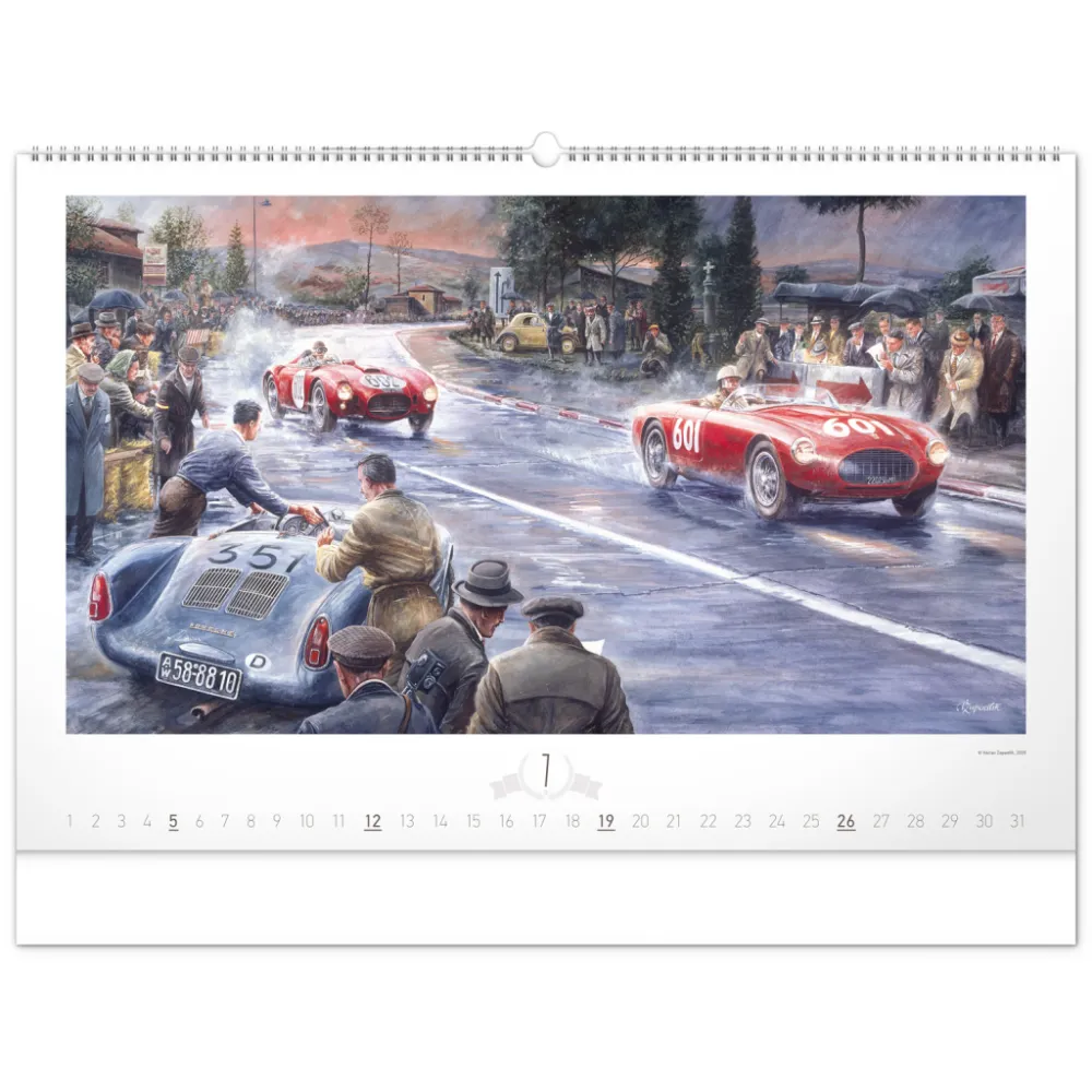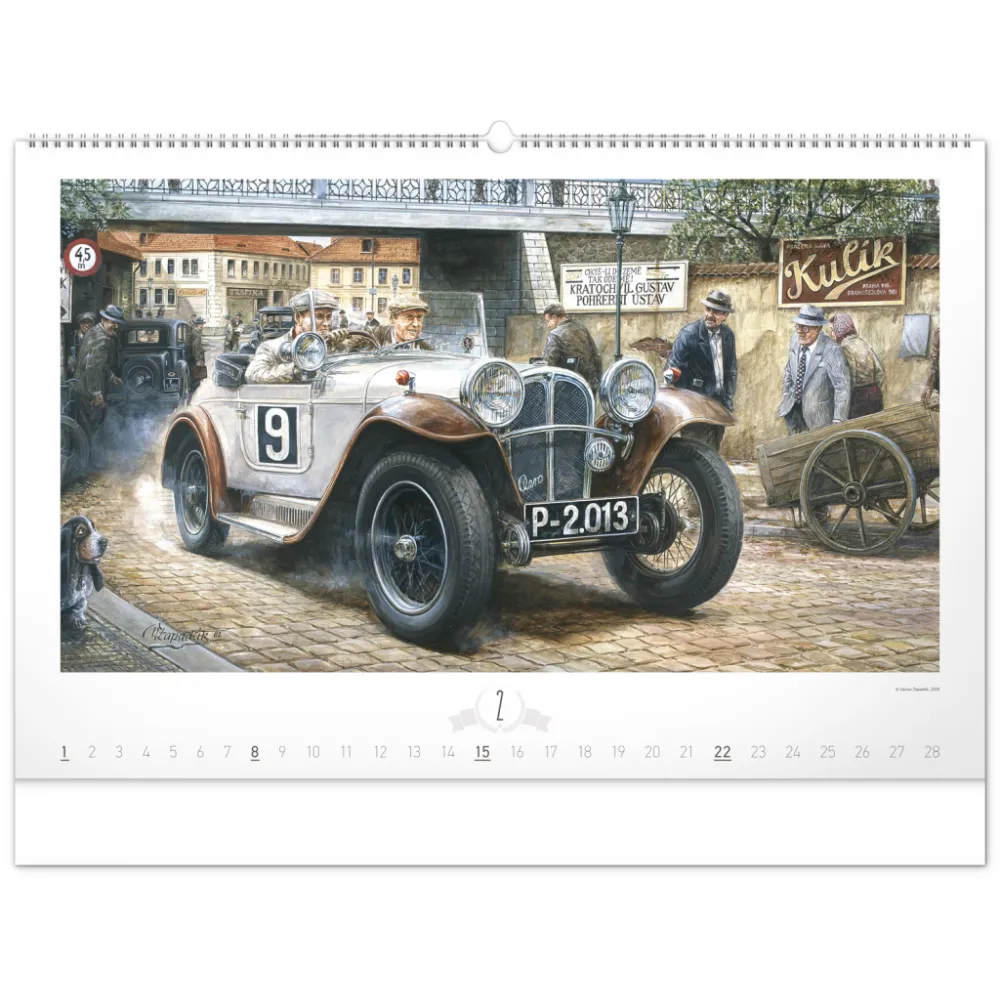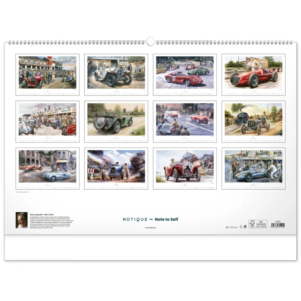 Krása starých sportovních automobilů a neopakovatelné závodní atmosféry od české ilustrátorské legendy Václava Zapadlíka. Nástěnný kalendář v šířkovém formátu je doplněn univerzálním kalendáriem se zvýrazněnými nedělemi.