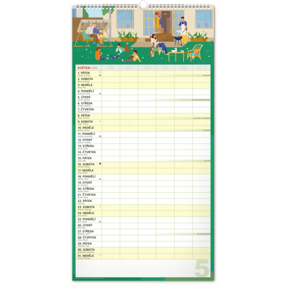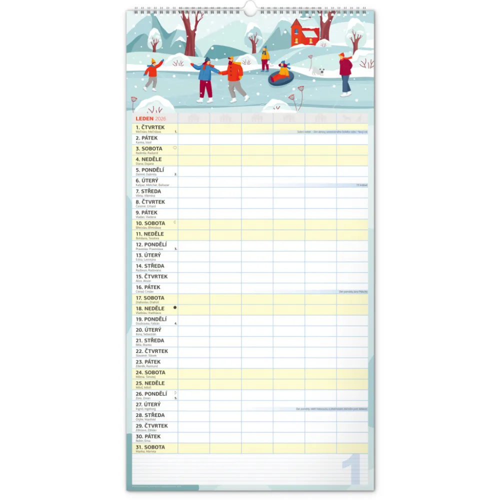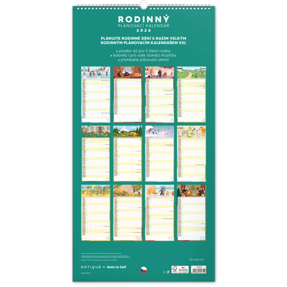 NOTIQUE Nástěnný kalendář Rodinný plánovací XXL 2026, 33 x 64 cm. Velký formát kalendáře pro celou rodinu. České kalendárium a samostatný plánovač aktivit až pro šest členů domácnosti doplňují veselé grafické motivy pro každé roční období. Díky dostatečnému prostoru pro poznámky vám neuteče žádná ...
