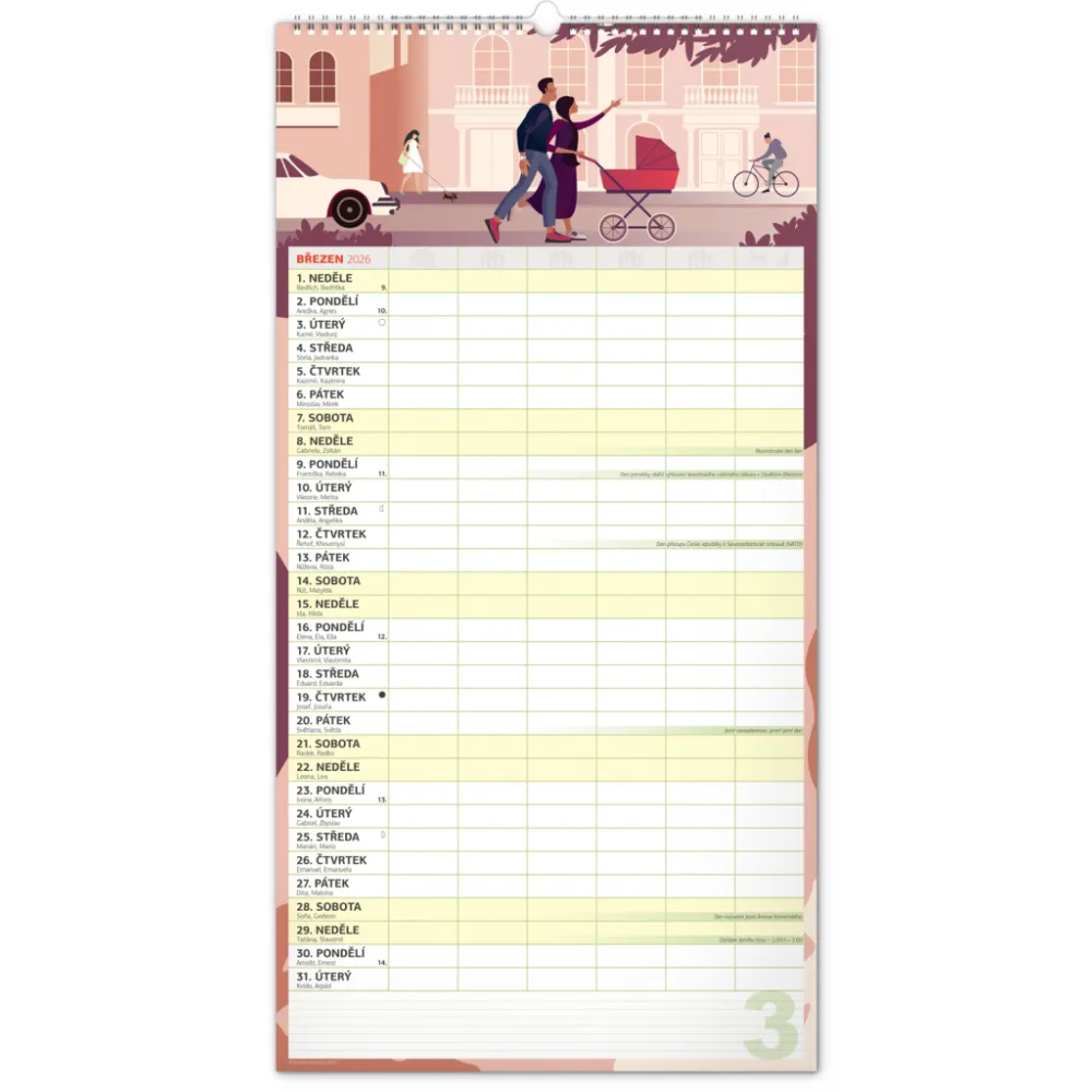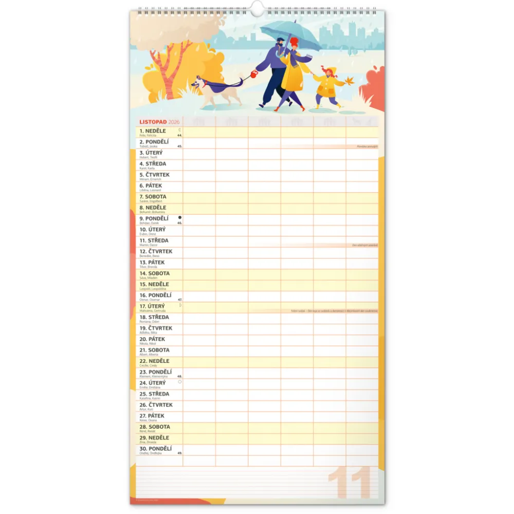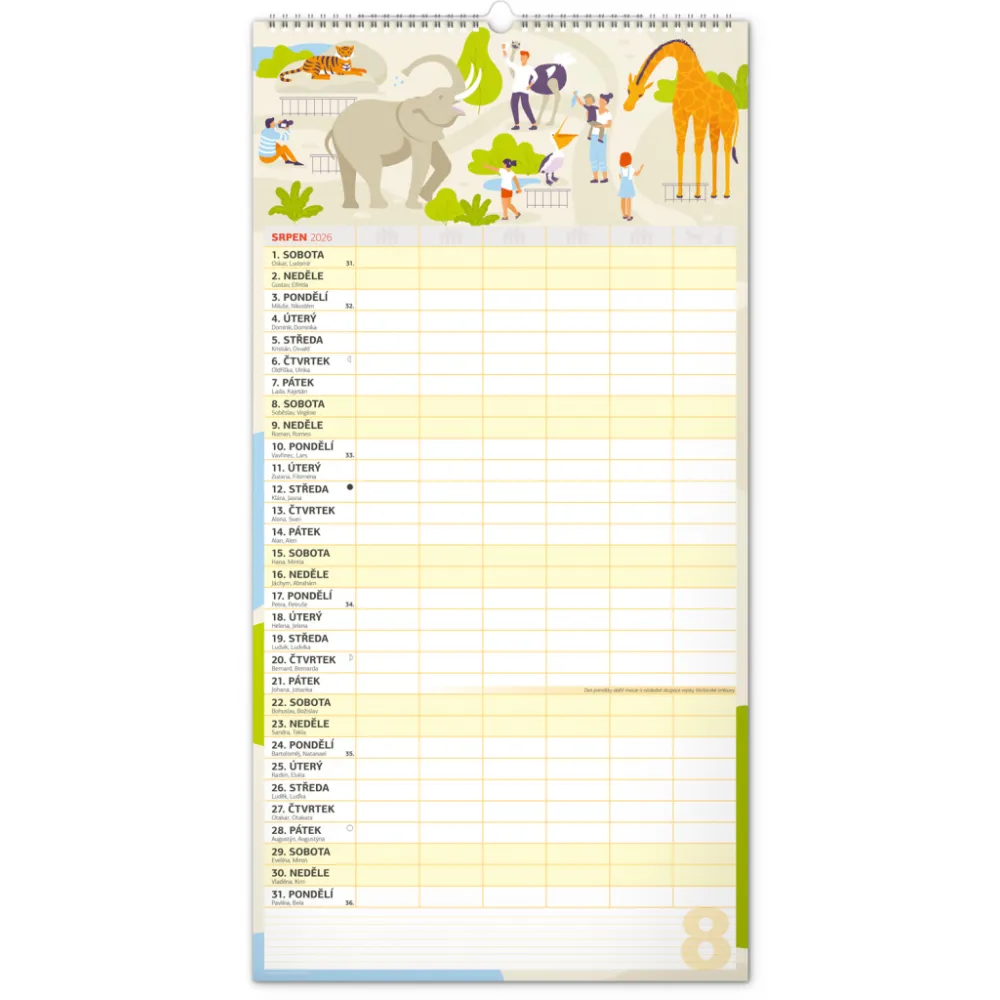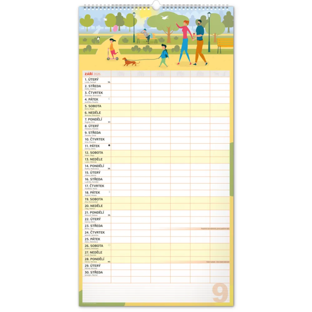 NOTIQUE Nástěnný kalendář Rodinný plánovací XXL 2026, 33 x 64 cm. Velký formát kalendáře pro celou rodinu. České kalendárium a samostatný plánovač aktivit až pro šest členů domácnosti doplňují veselé grafické motivy pro každé roční období. Díky dostatečnému prostoru pro poznámky vám neuteče žádná ...