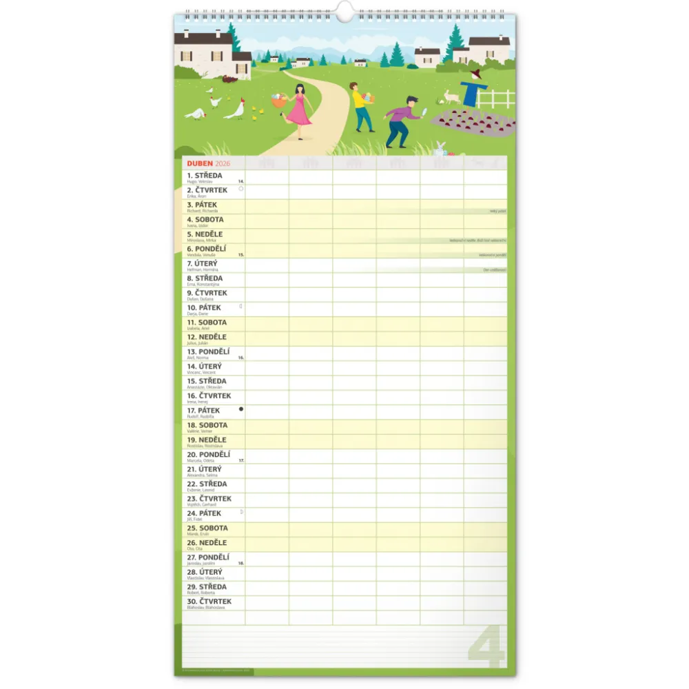 Velký formát kalendáře pro celou rodinu. České kalendárium a samostatný plánovač aktivit až pro šest členů domácnosti doplňují veselé grafické motivy pro každé roční období. Díky dostatečnému prostoru pro poznámky vám neuteče žádná důležitá událost.