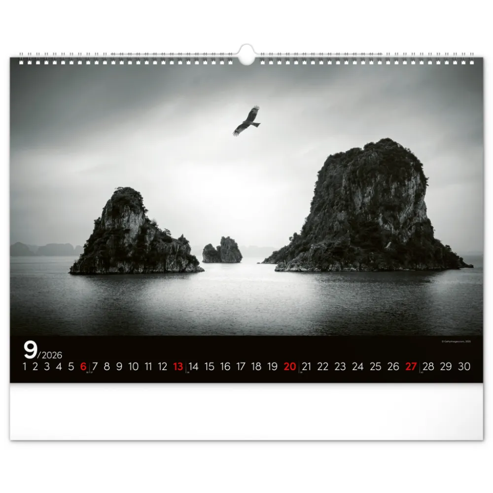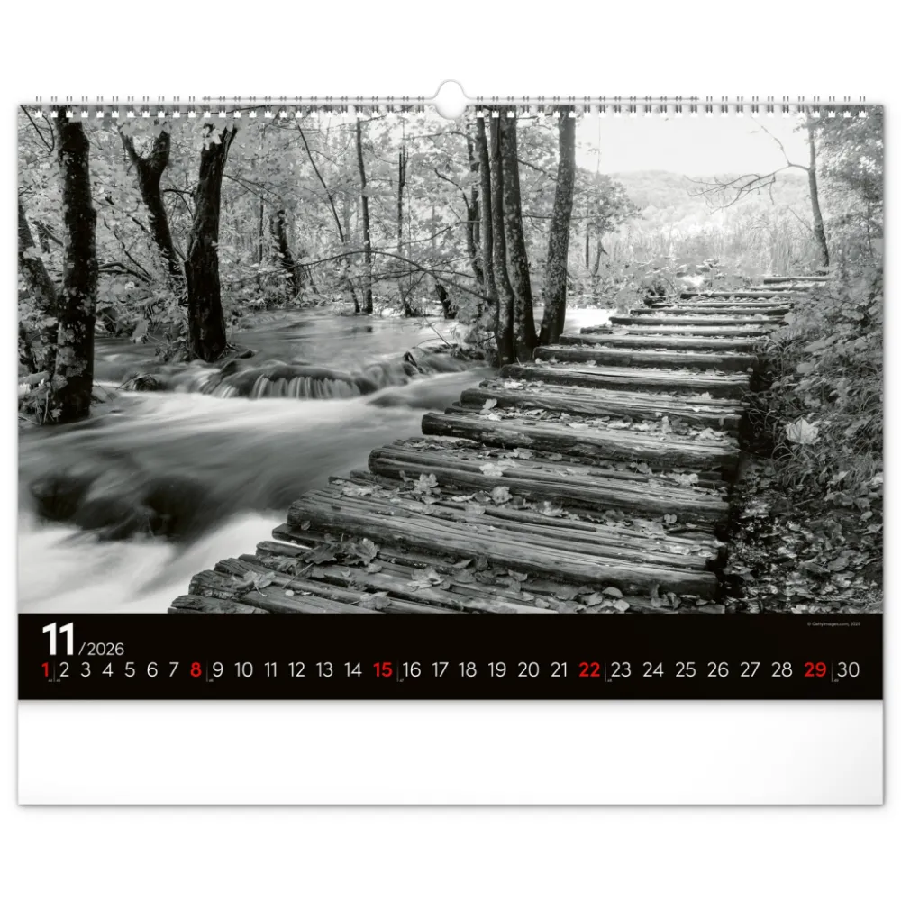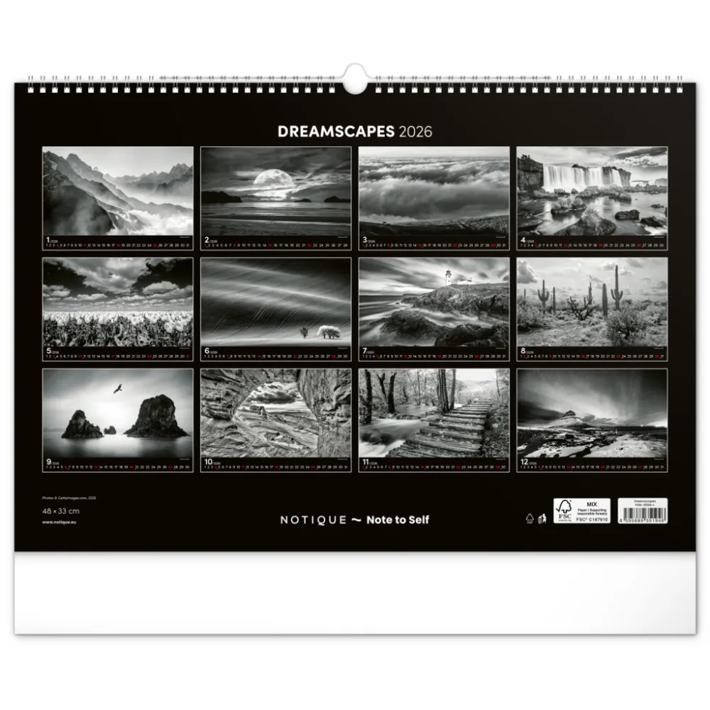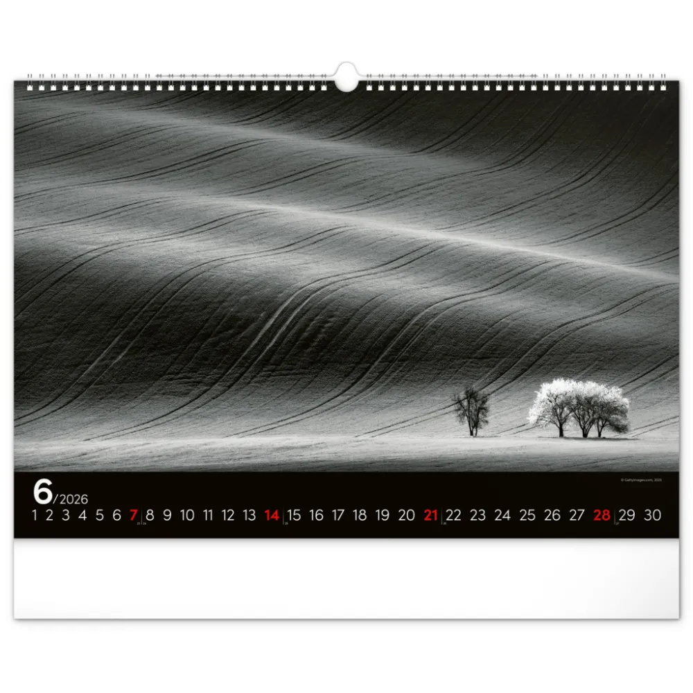 NOTIQUE Nástěnný kalendář Snová krajina 2026, 48 x 33 cm. Zasněte se při pohledu na dvanáct úchvatných snímků krajiny v černobílém hávu. Jednoduché kalendárium na černém pozadí.