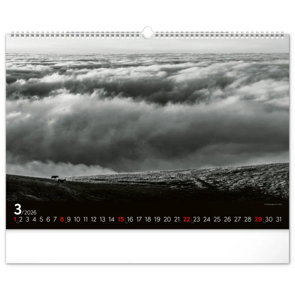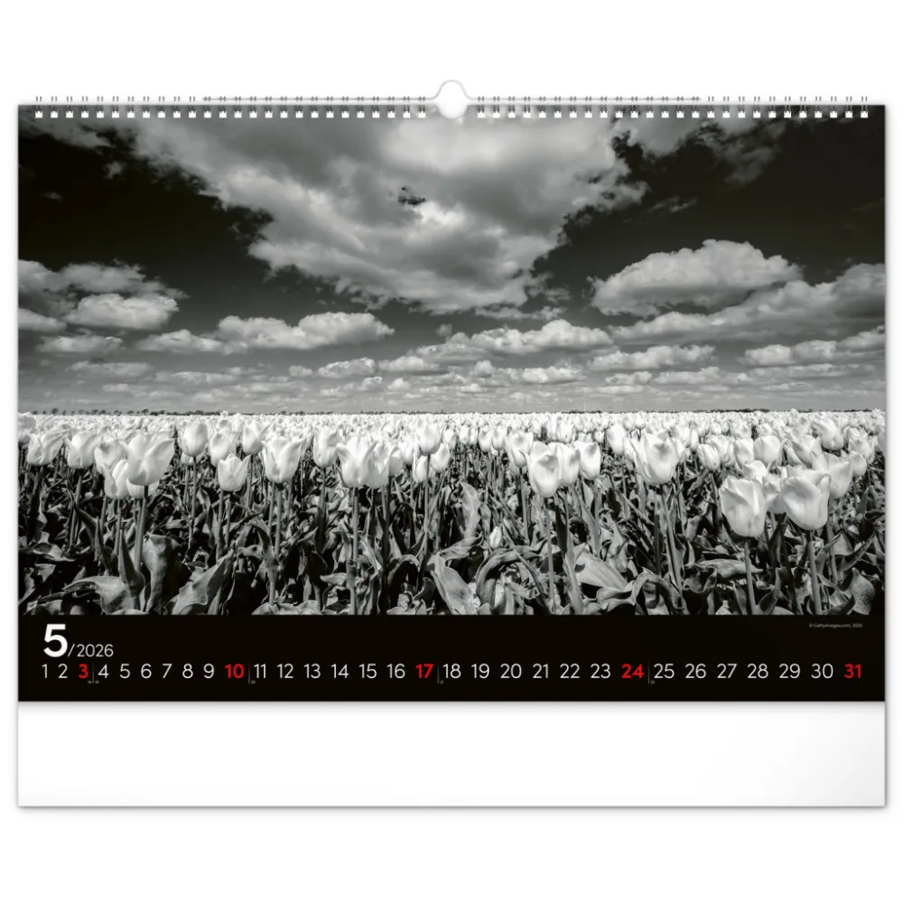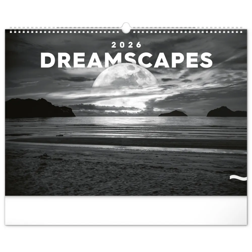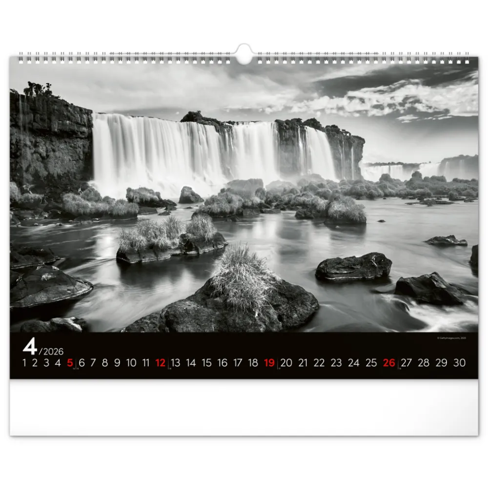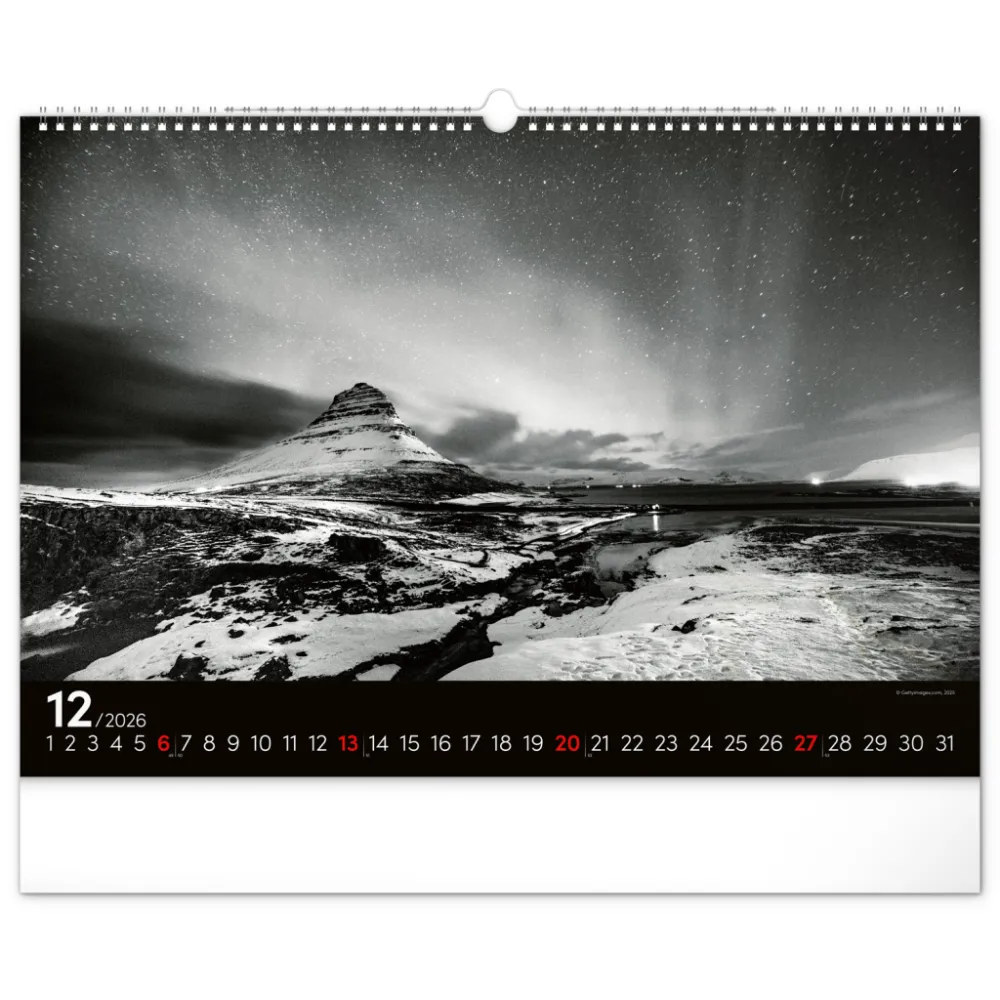 NOTIQUE Nástěnný kalendář Snová krajina 2026, 48 x 33 cm. Zasněte se při pohledu na dvanáct úchvatných snímků krajiny v černobílém hávu. Jednoduché kalendárium na černém pozadí.