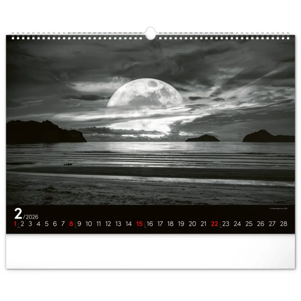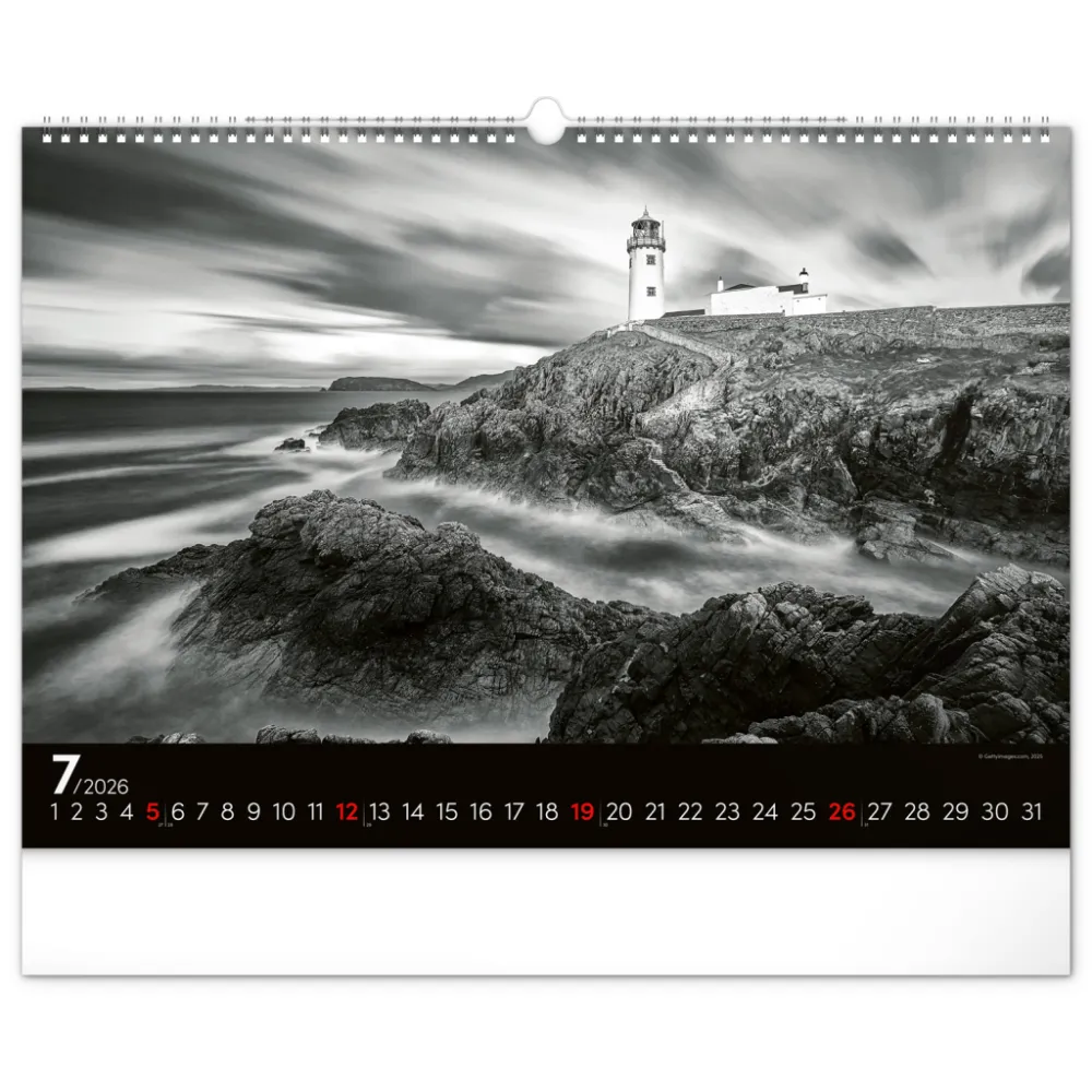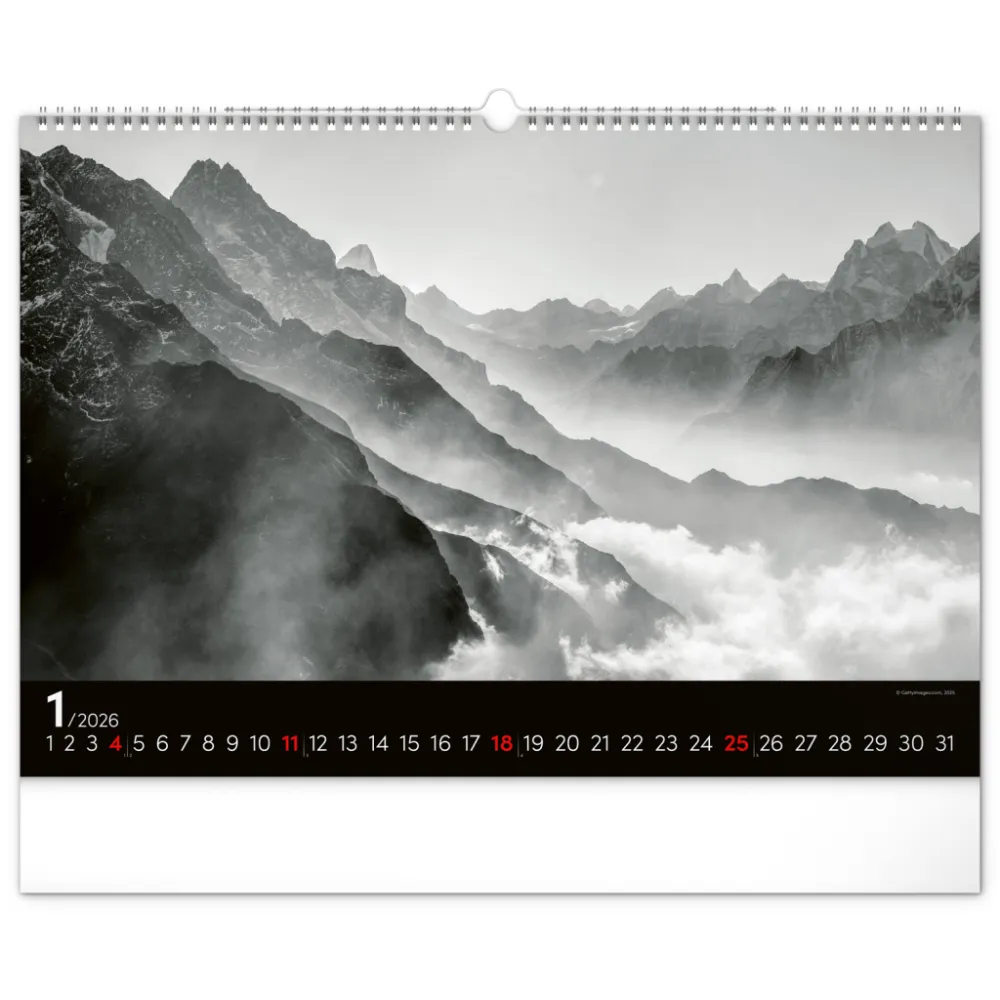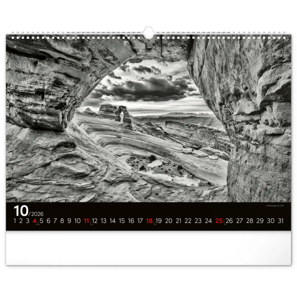 NOTIQUE Nástěnný kalendář Snová krajina 2026, 48 x 33 cm. Zasněte se při pohledu na dvanáct úchvatných snímků krajiny v černobílém hávu. Jednoduché kalendárium na černém pozadí.