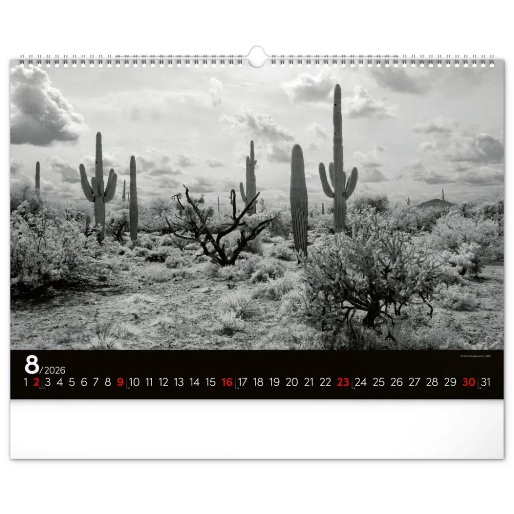 Zasněte se při pohledu na dvanáct úchvatných snímků krajiny v černobílém hávu. Jednoduché kalendárium na černém pozadí.
