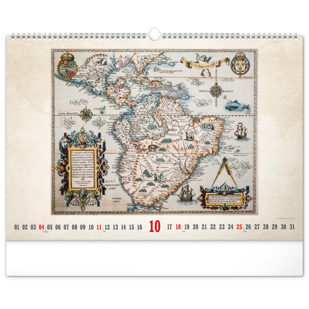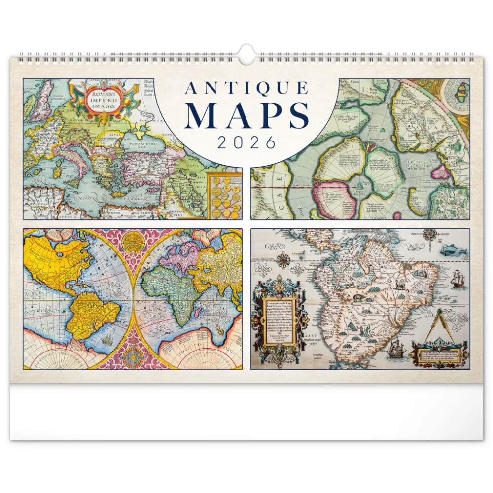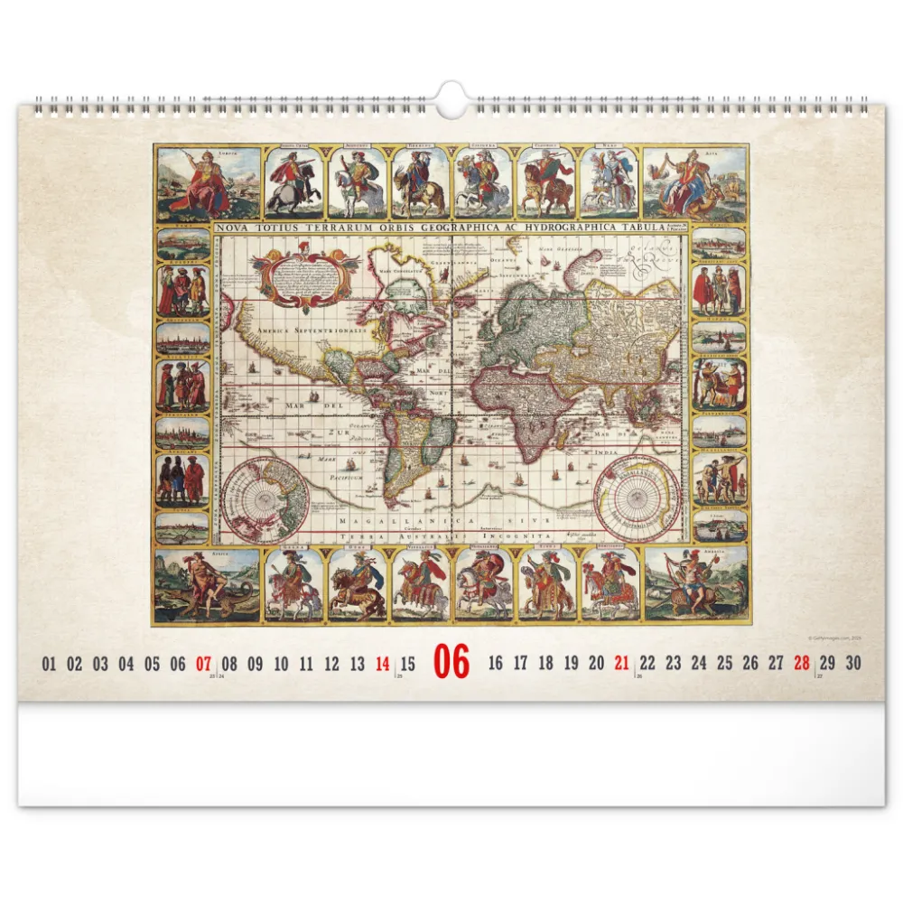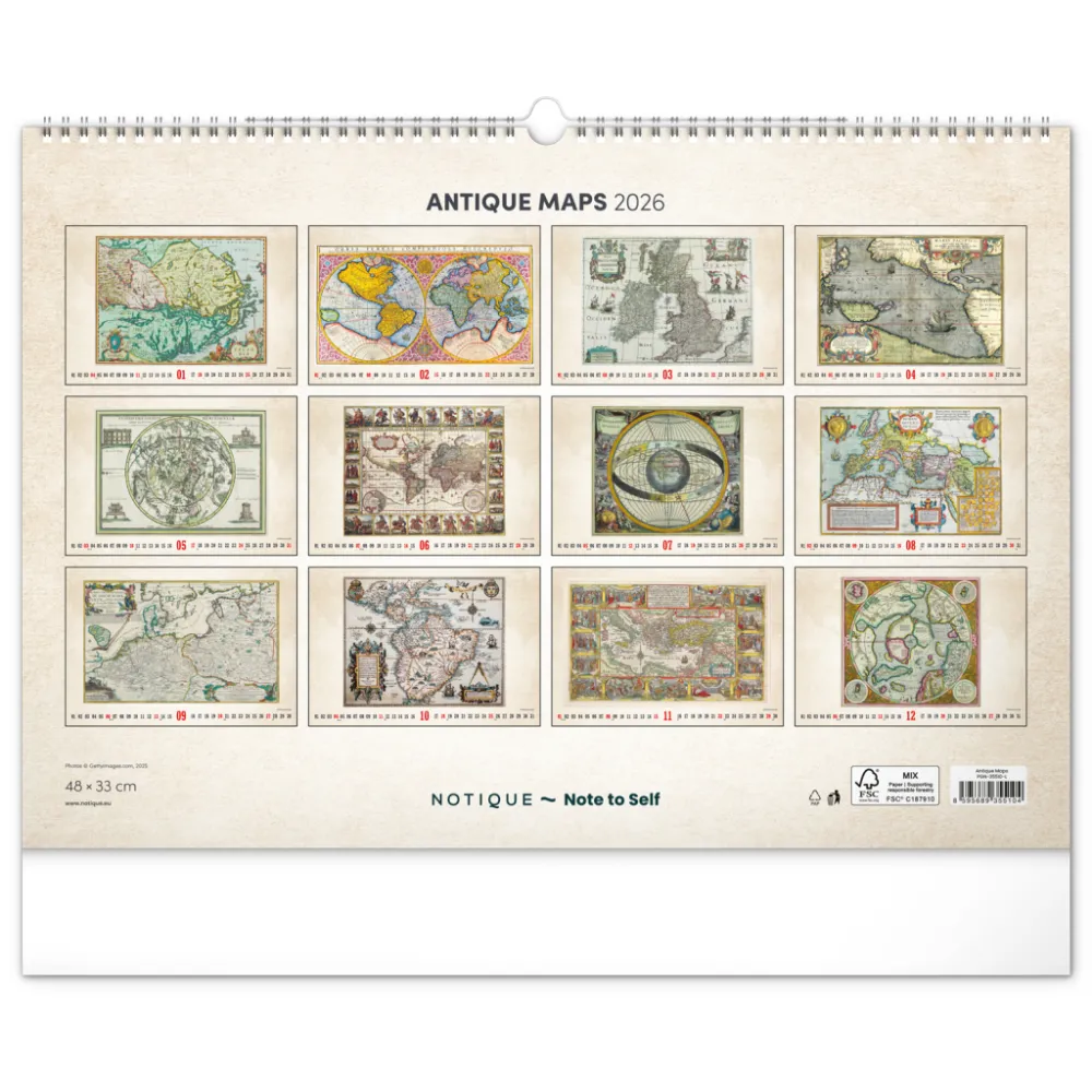 NOTIQUE Nástěnný kalendář Staré mapy 2026, 48 x 33 cm. Kalendář pro všechny znalce ručně vytvořených map z dávných dob. Detailní kresby s estetickou hodnotou ale potěší i milovníky užitého umění. Jednoduché kalendárium na bílém pozadí.