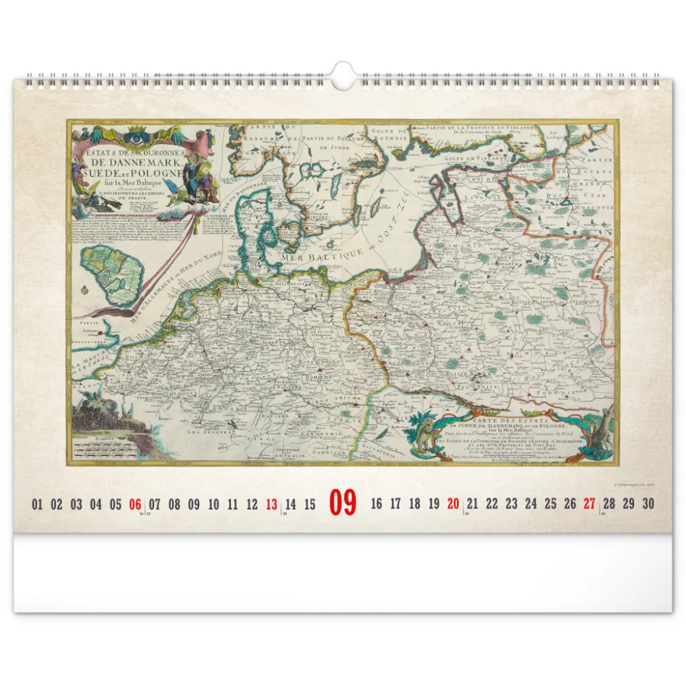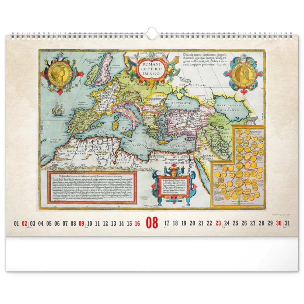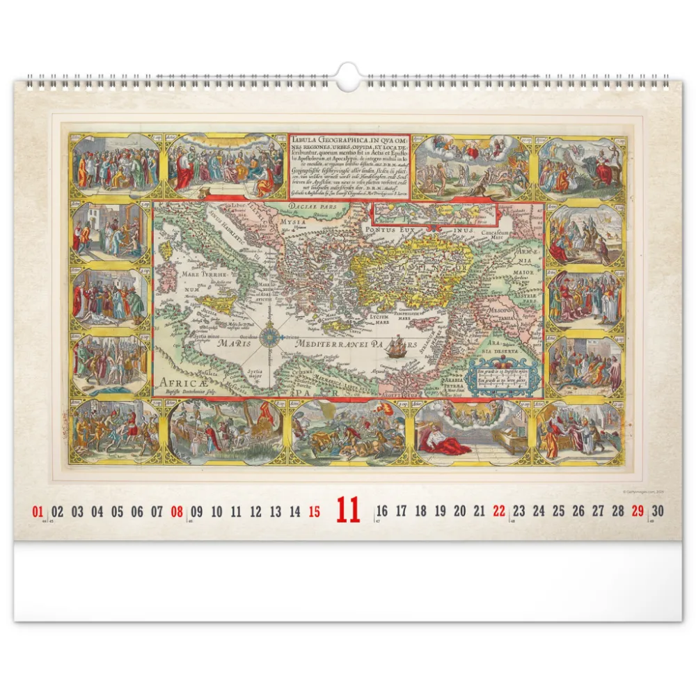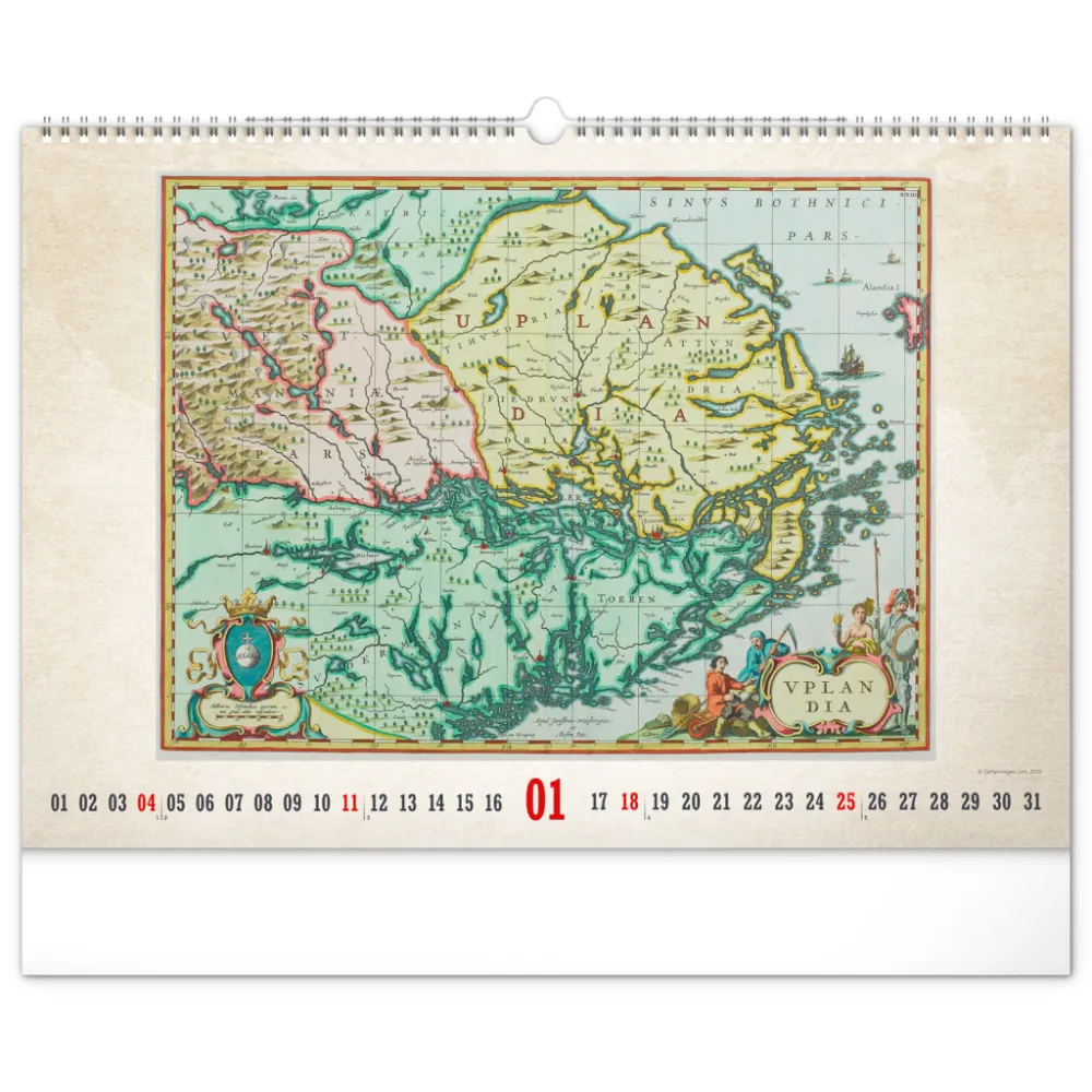 NOTIQUE Nástěnný kalendář Staré mapy 2026, 48 x 33 cm. Kalendář pro všechny znalce ručně vytvořených map z dávných dob. Detailní kresby s estetickou hodnotou ale potěší i milovníky užitého umění. Jednoduché kalendárium na bílém pozadí.