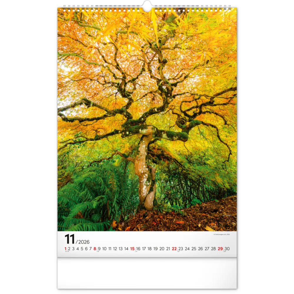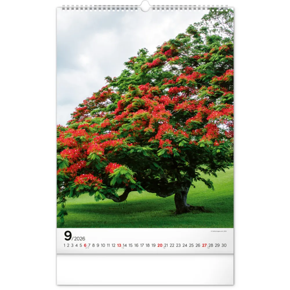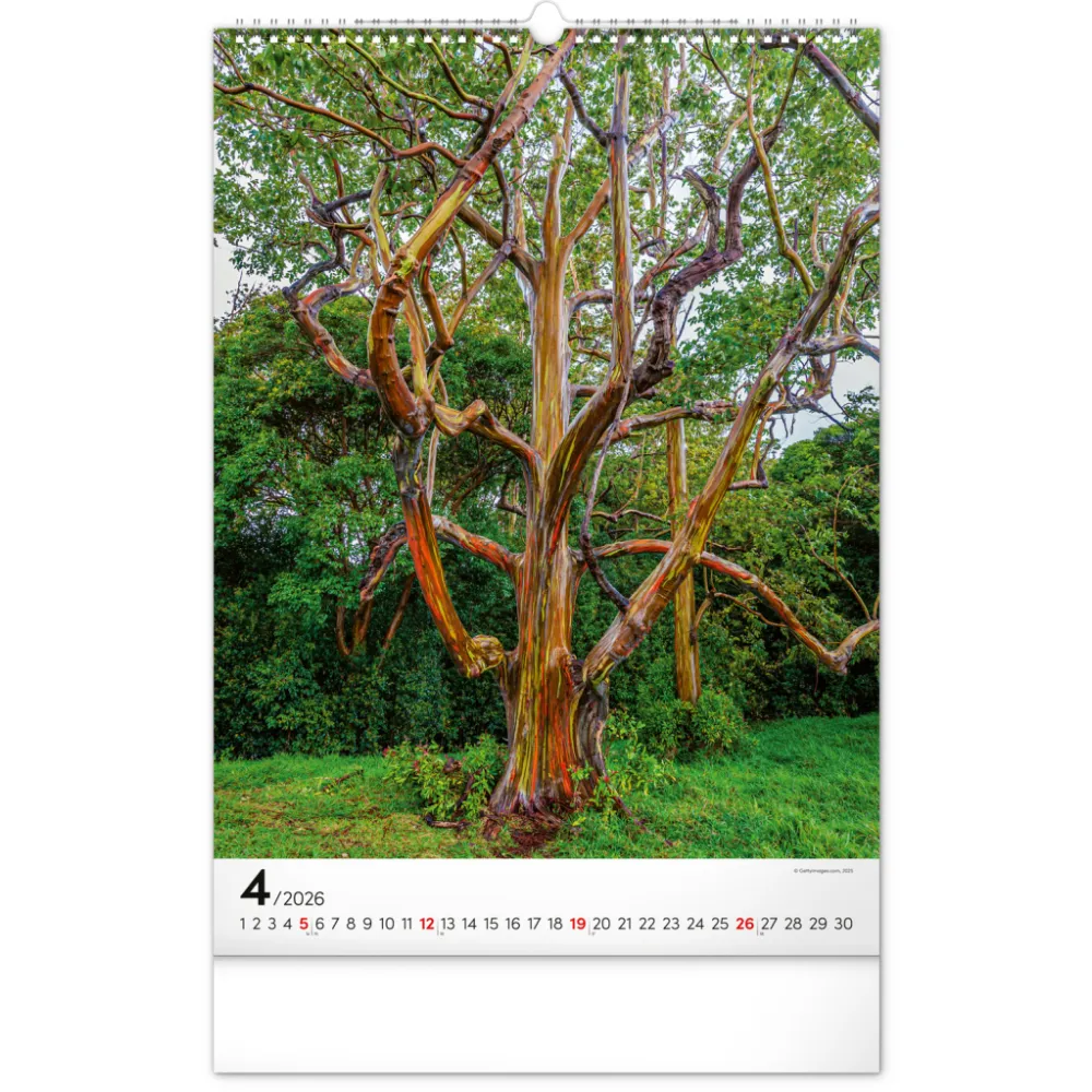 Nástěnný kalendář s fotografiemi pestrých scenérií s dominantami majestátních stromů z celého světa. Fotografie jsou doplněny univerzálním kalendáriem na bílém pozadí.