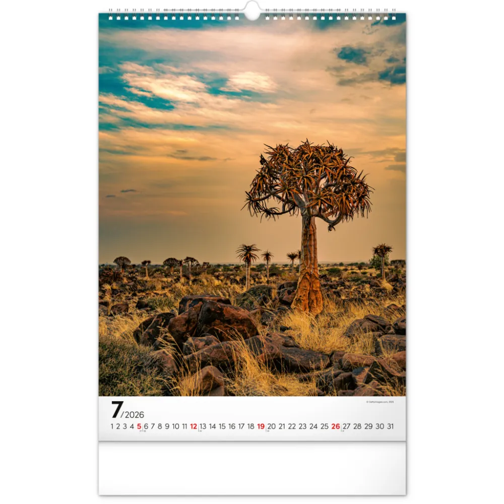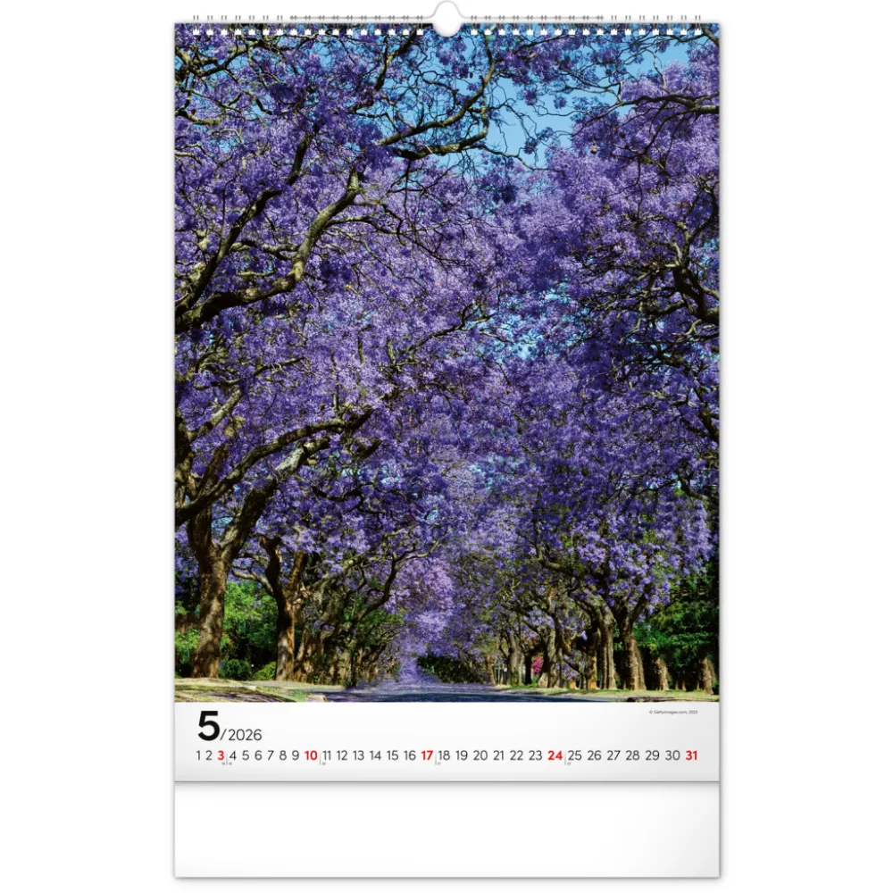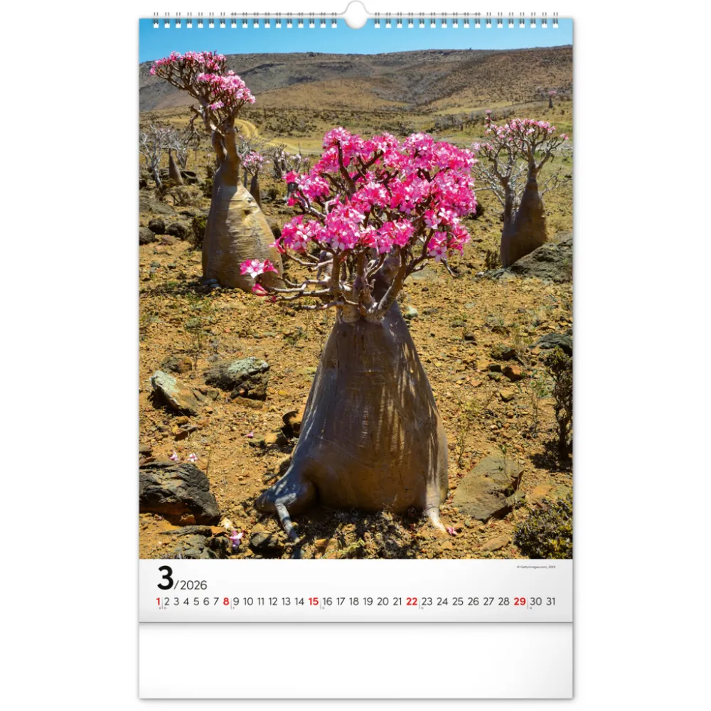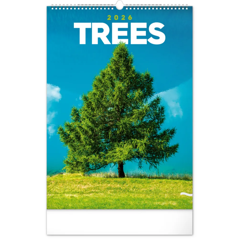Nástěnný kalendář s fotografiemi pestrých scenérií s dominantami majestátních stromů z celého světa. Fotografie jsou doplněny univerzálním kalendáriem na bílém pozadí.