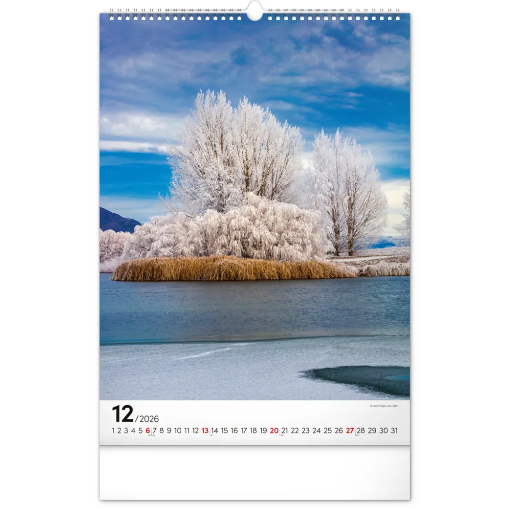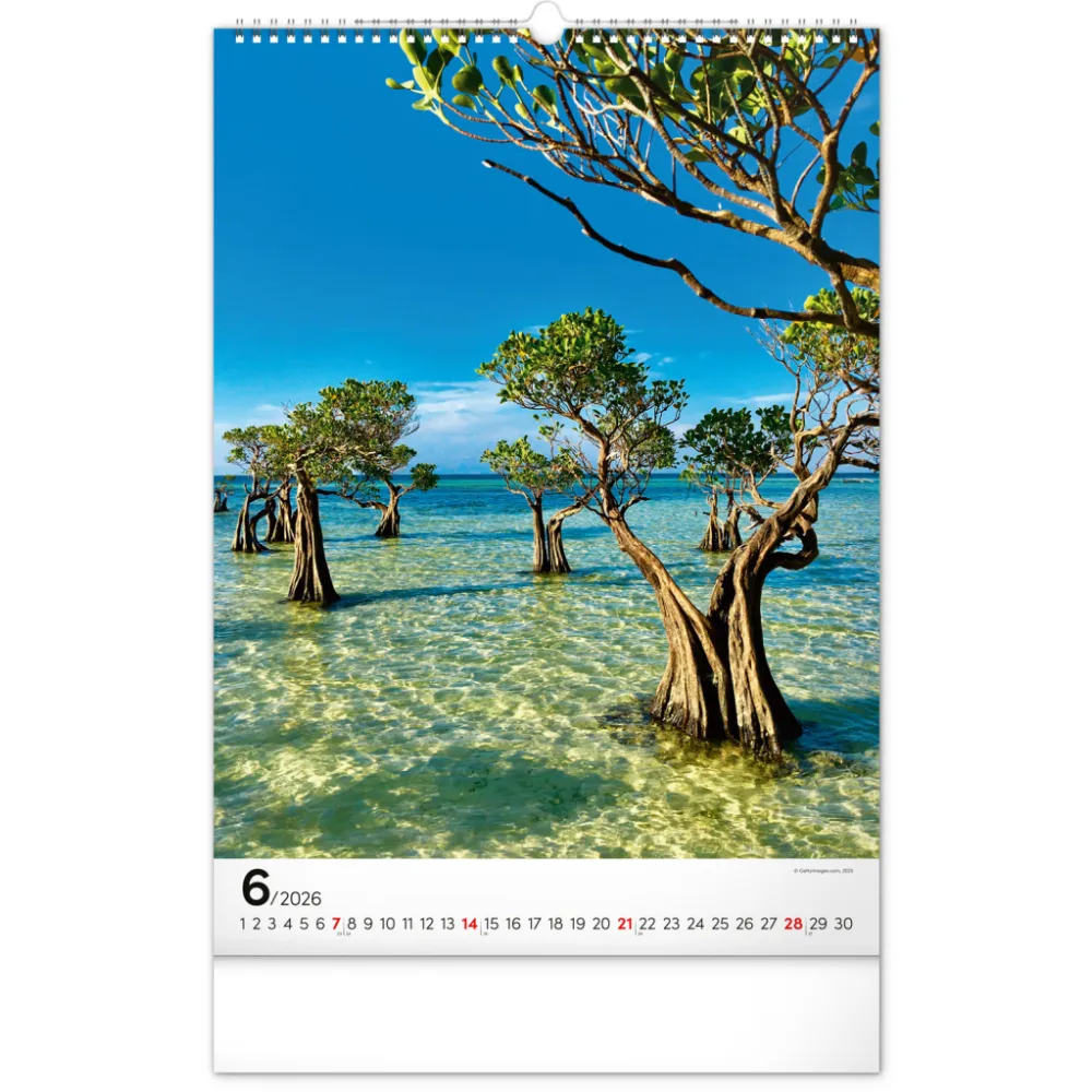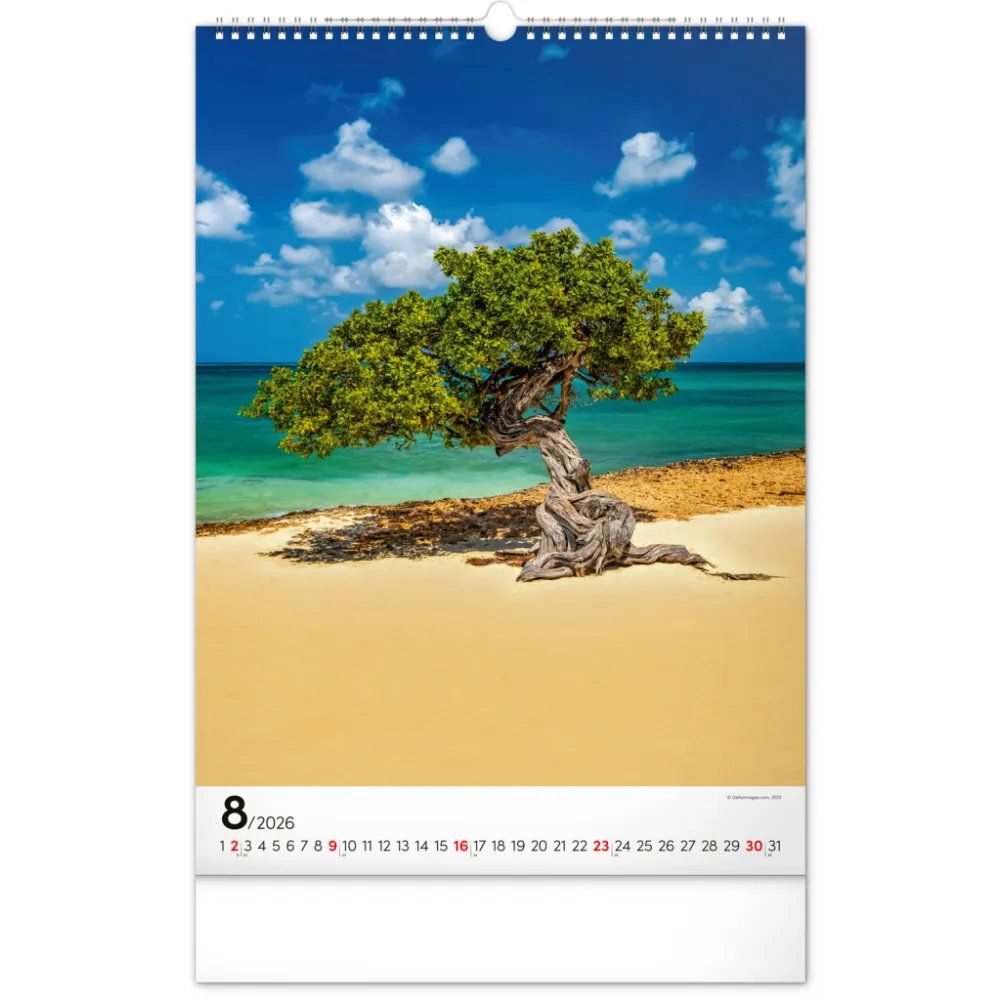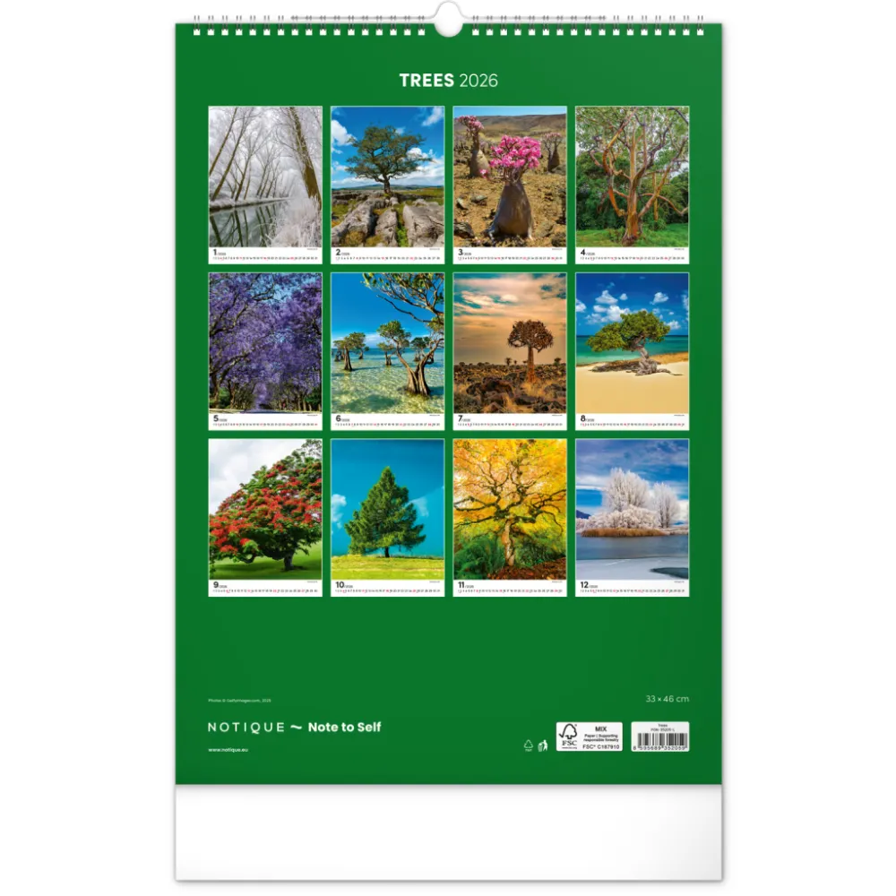 NOTIQUE Nástěnný kalendář Stromy 2026, 33 x 46 cm. Nástěnný kalendář s fotografiemi pestrých scenérií s dominantami majestátních stromů z celého světa. Fotografie jsou doplněny univerzálním kalendáriem na bílém pozadí.